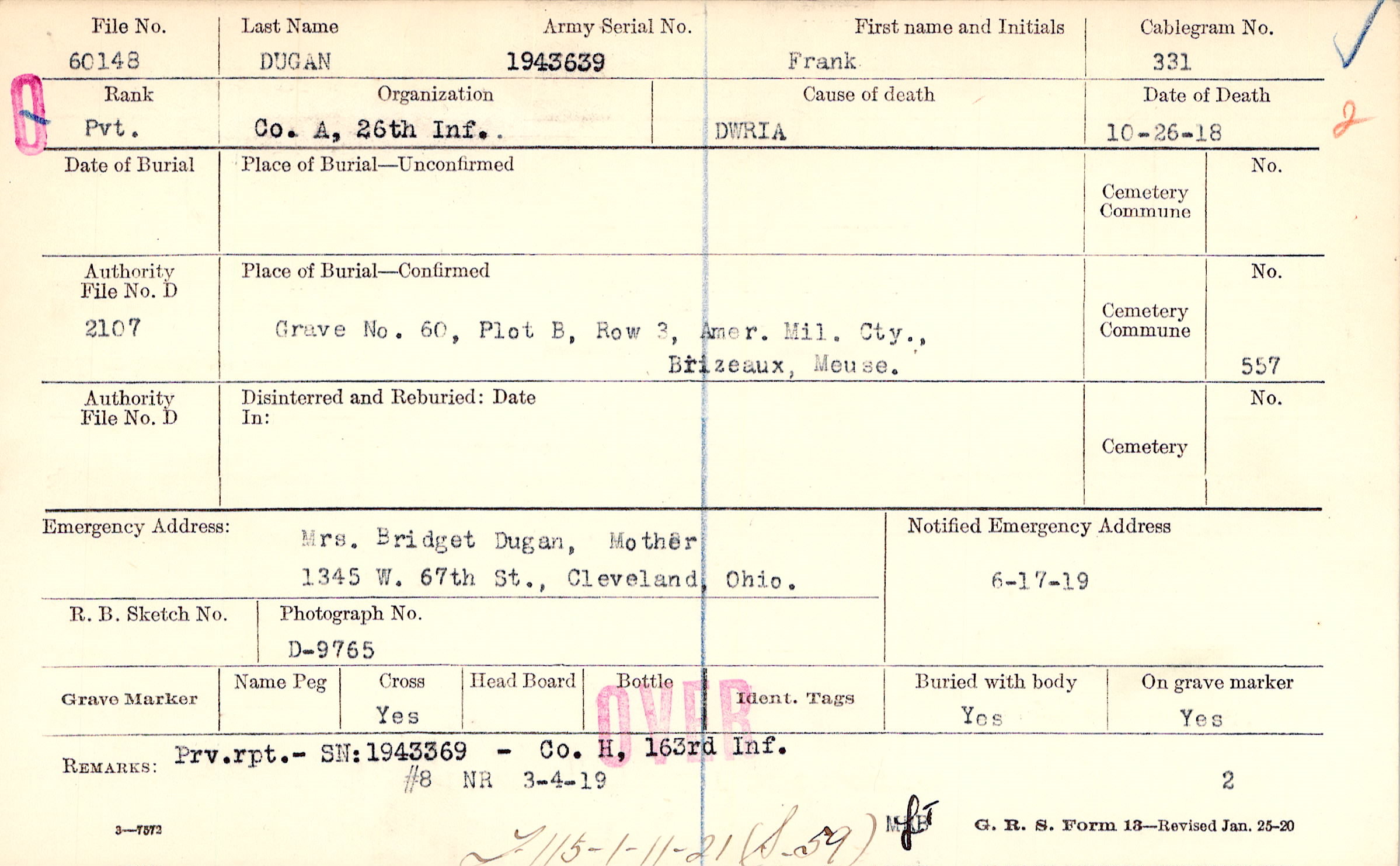 Mrs. Bridget Dugan, Mother, 1345 W. 67th St., Cleveland, Ohio.