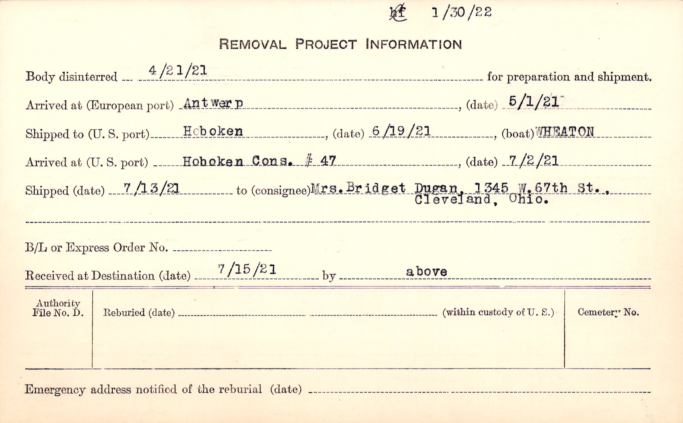 Body disinterred 4/21/1921 for preparation and shipment.