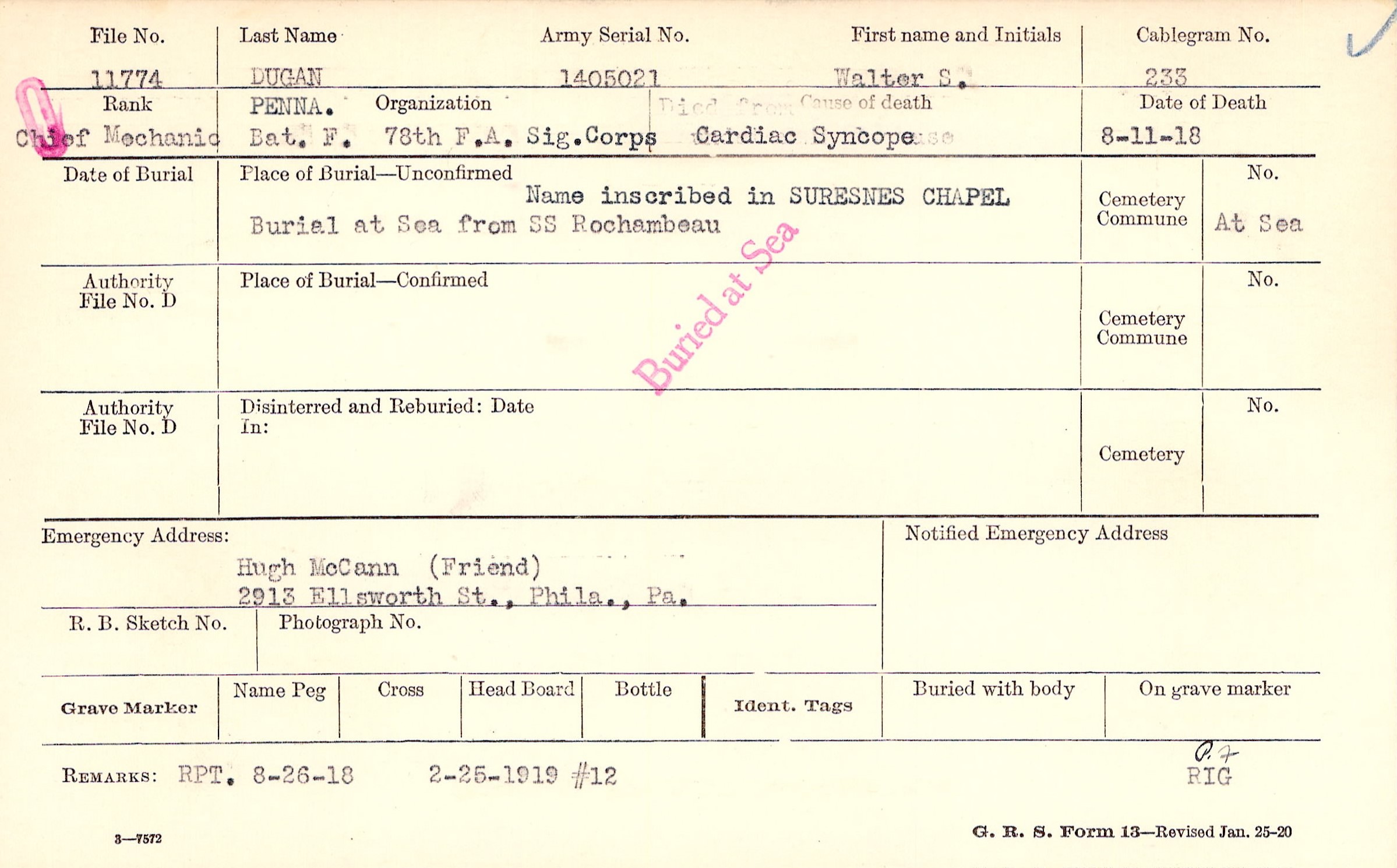 Name inscribed in SURESNES CHAPEL, Burial at Sea from SS Rochambeau