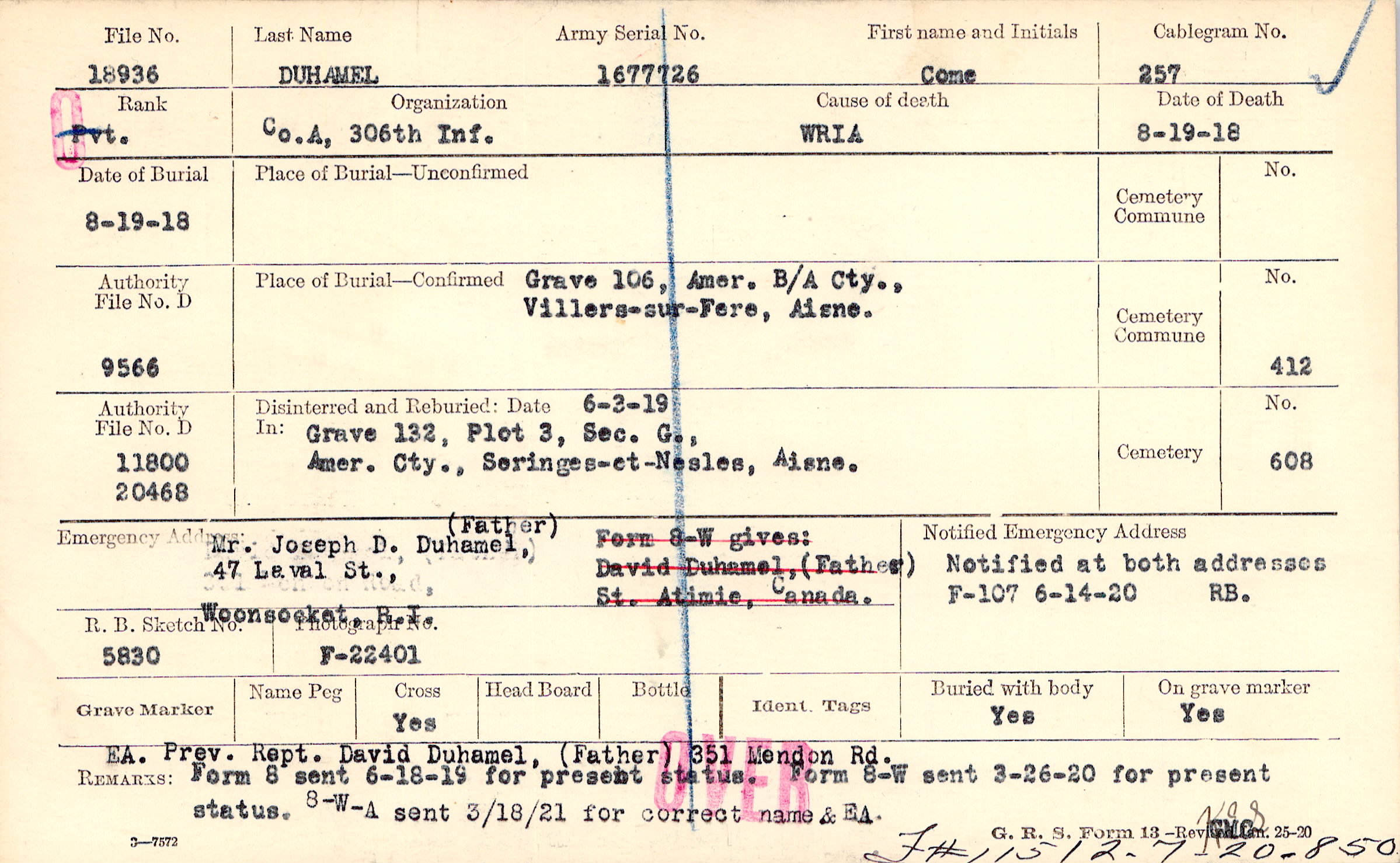 Mr. Joseph D. Duhamel, (Father), 47 Laval St., Woonsocket, R.I.