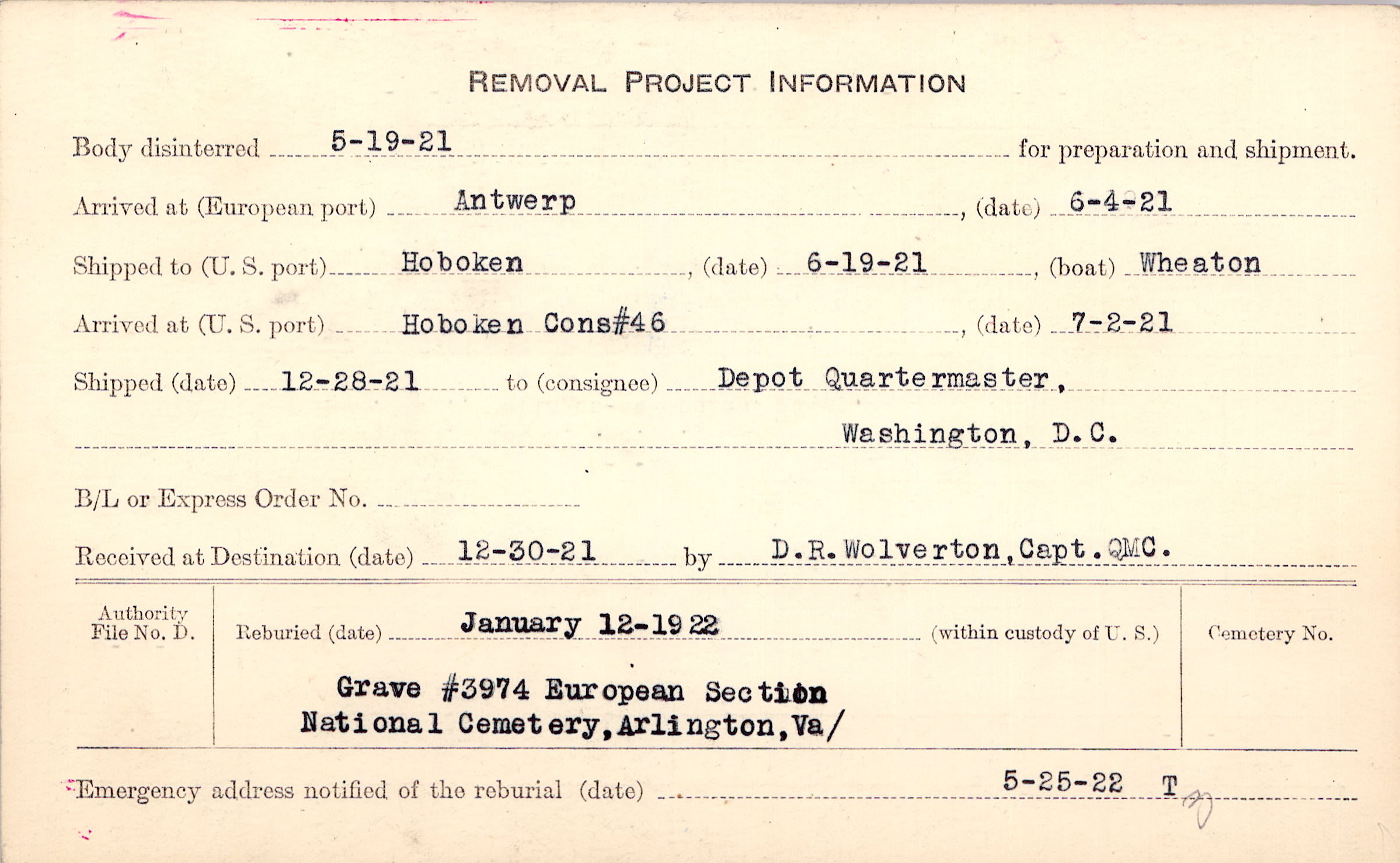 Body disinterred 5/19/1921 for preparation and shipment.