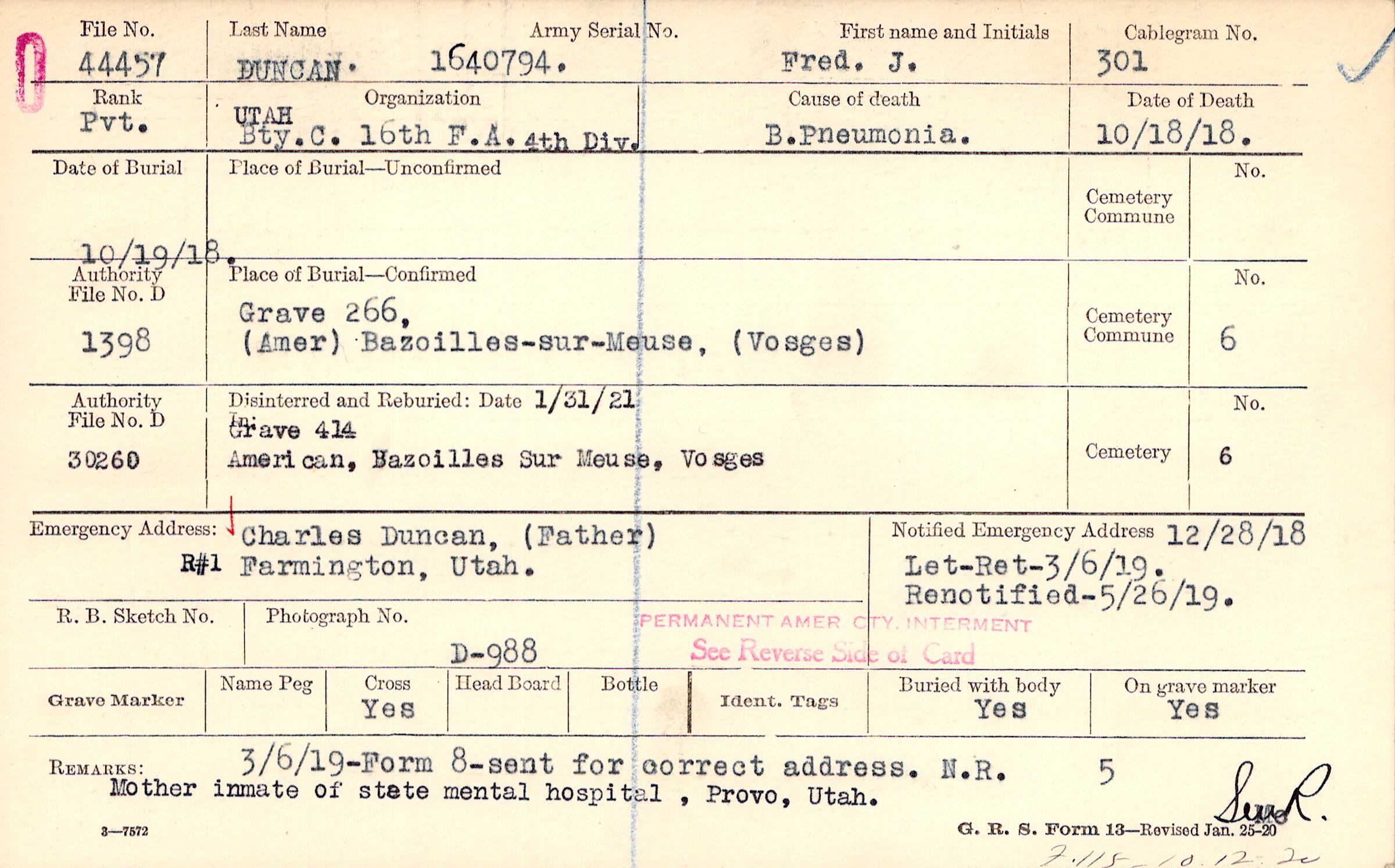Charles Duncan, (Father), R#1 Farmington, Utah.