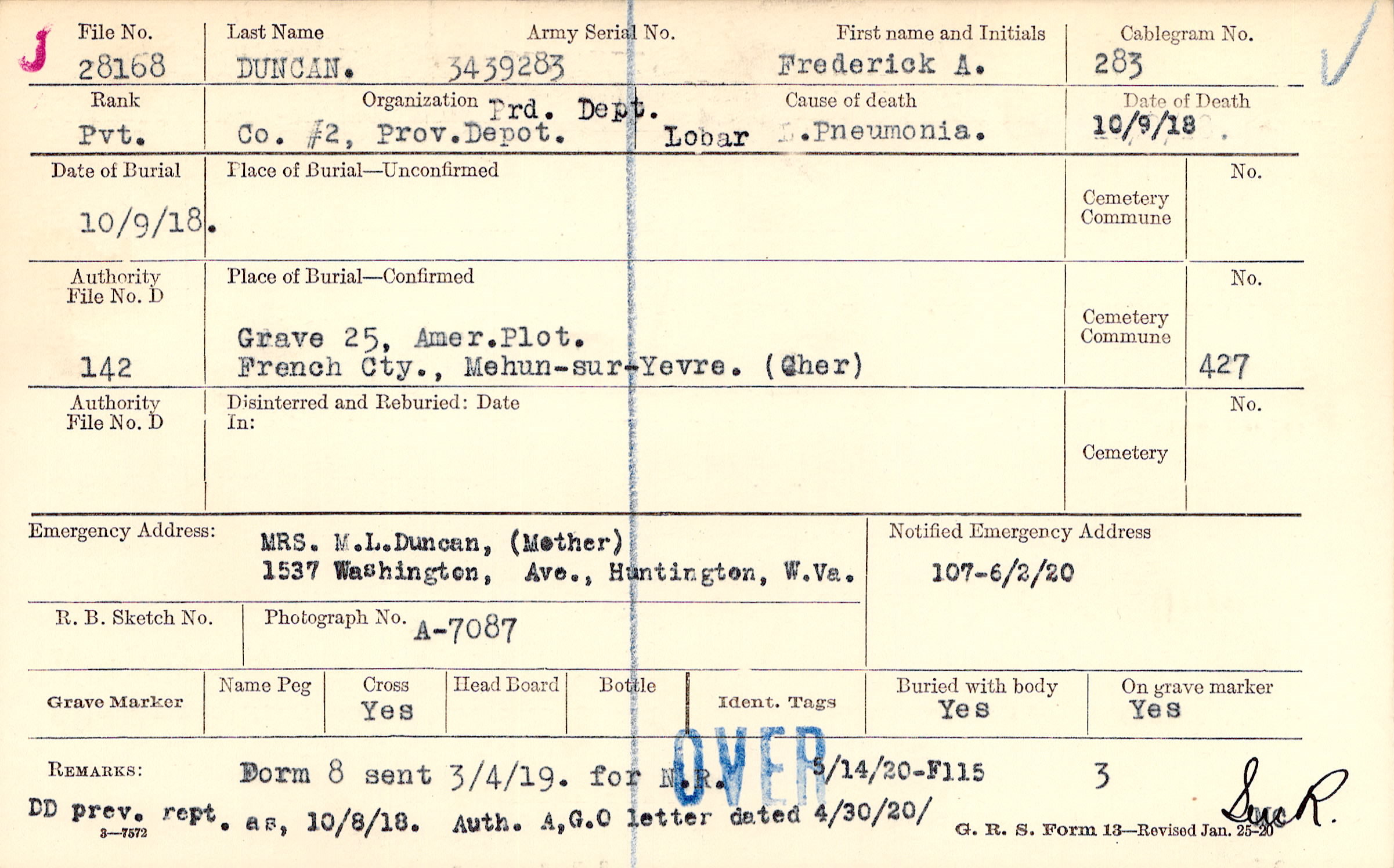 Grave 25, Amer. Plot.,French Cty., Mehun-sur-Yevre. ) (Cher)