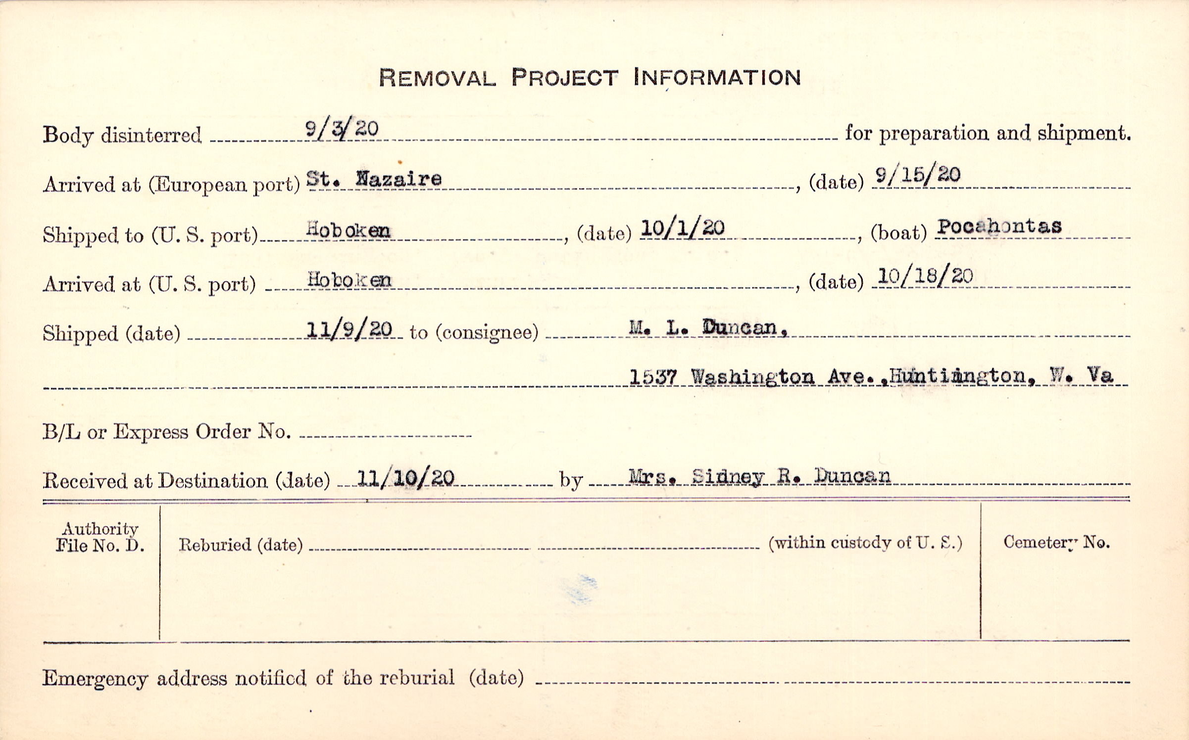 MRS. M.L. Duncan (Mother), 1537 Washington, Ave., Huntington, W.Va.