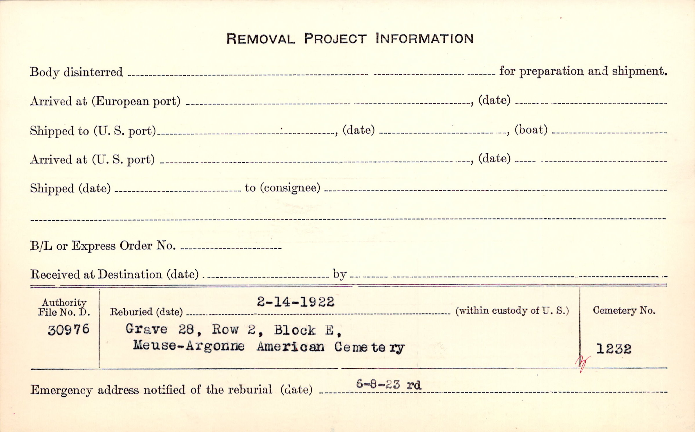| Permanent Burial in Foreign Cemetery |