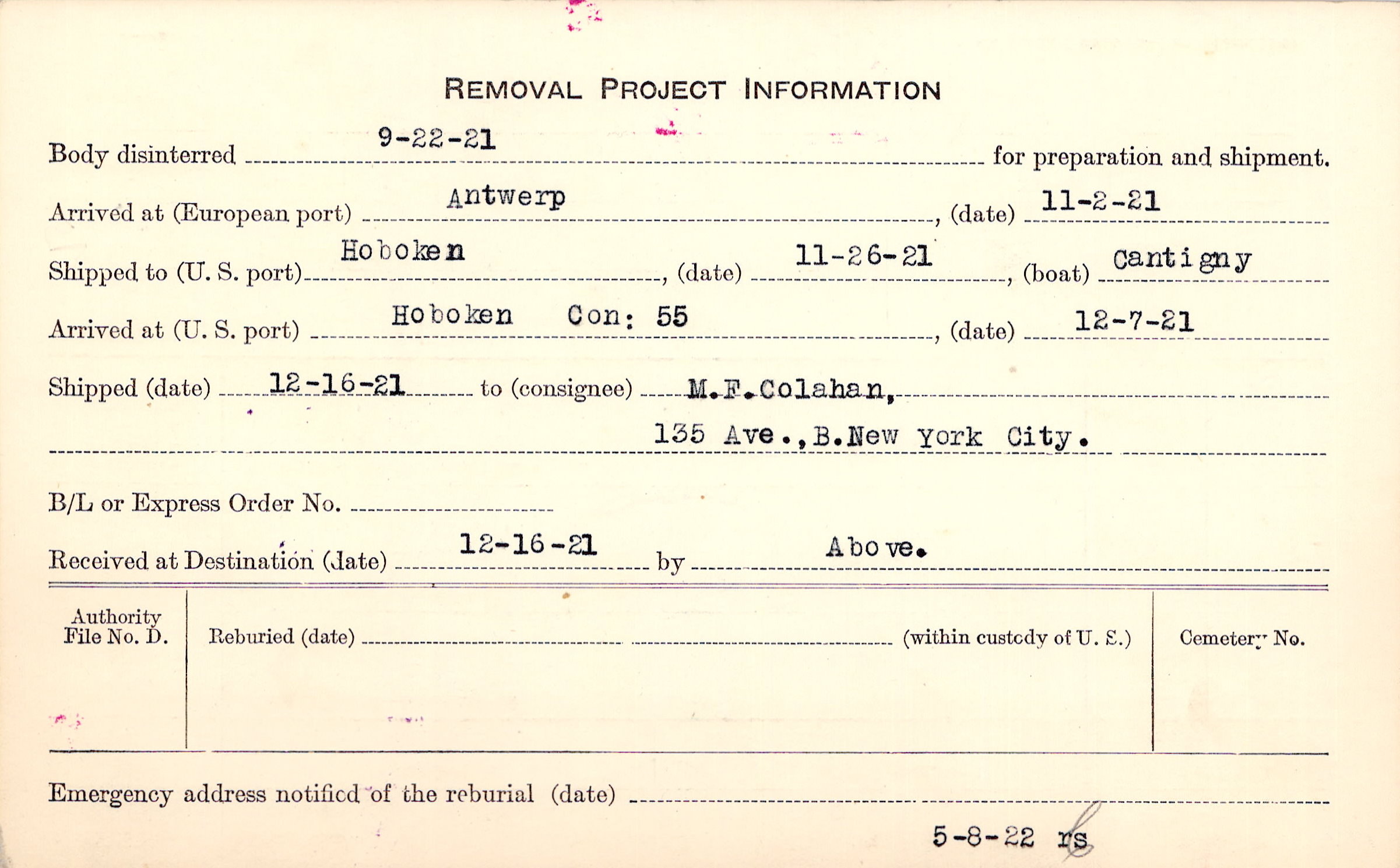Body disinterred 9/22/1921 for preparation and shipment.
