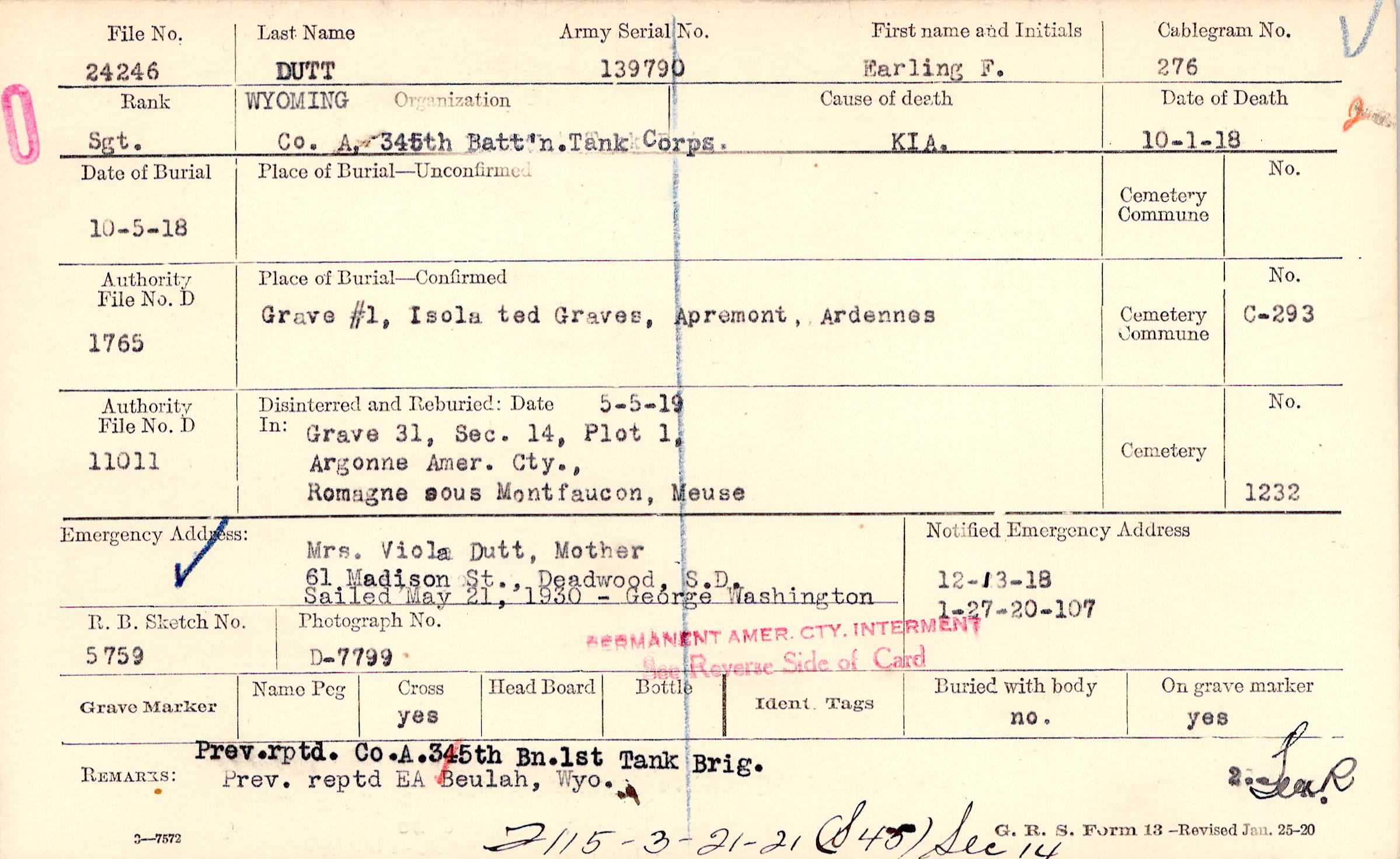 12/13/1918, Form 107: 1/27/1920