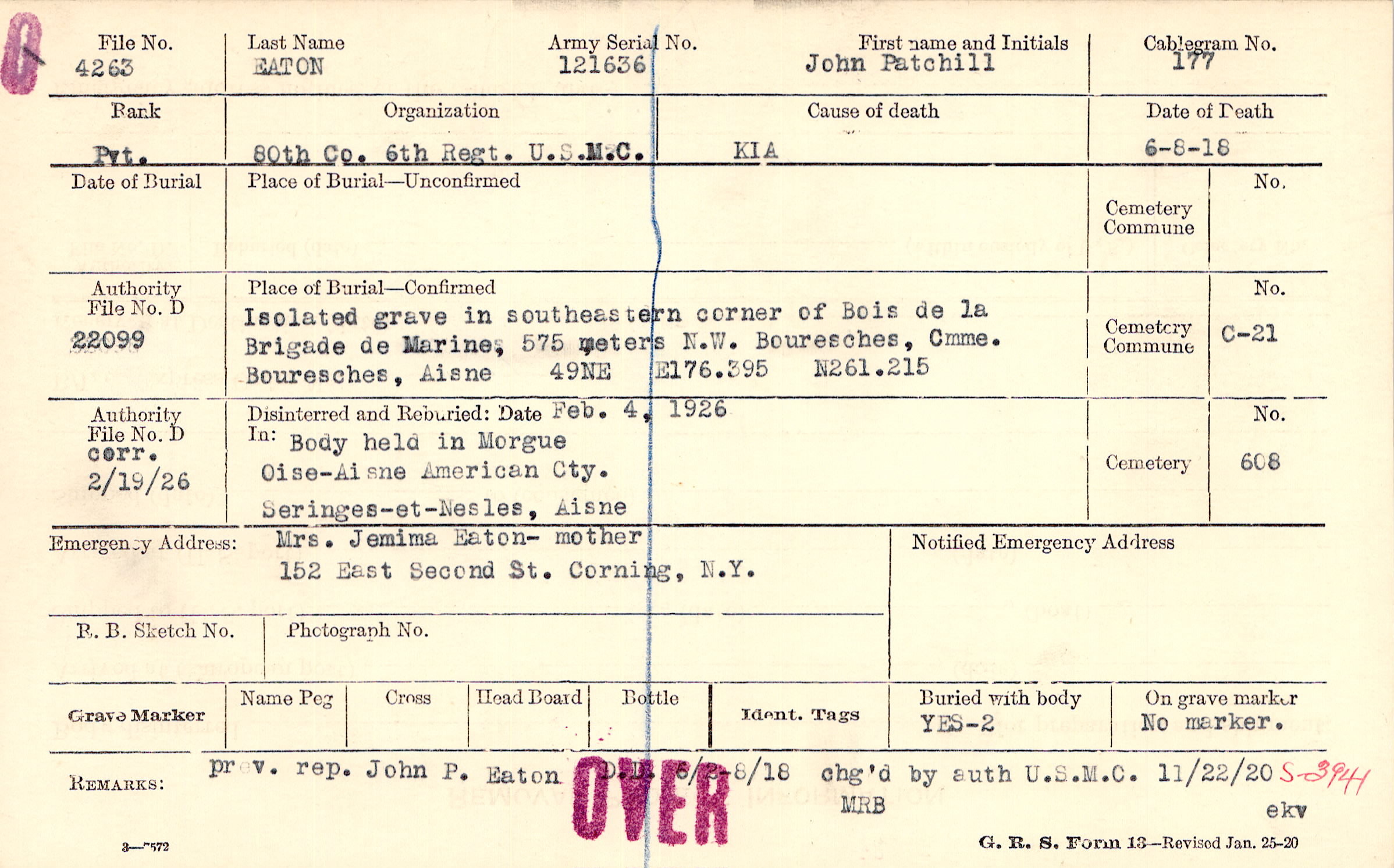 American B/A Cemetery, Seringes-et-Nesles, Aisne, Body held in Morgue