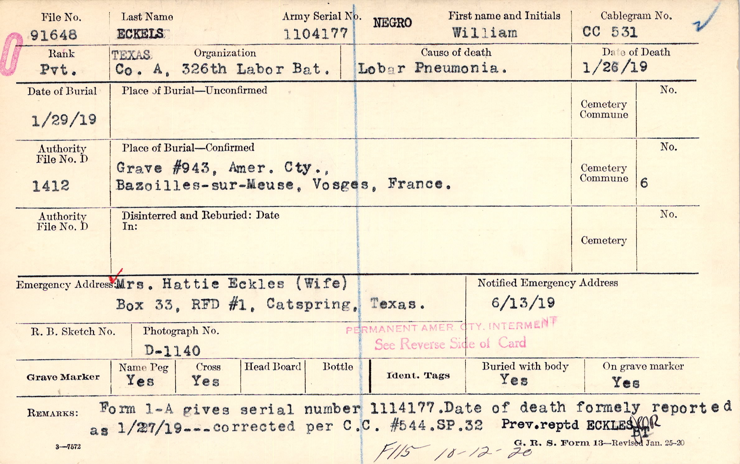 Mrs. Hattie Eckles (Wife), Box 33, RFD #1, Catspring, Texas.