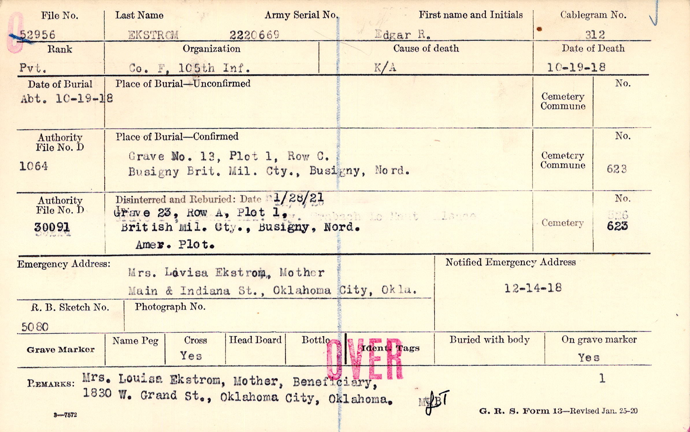 Mrs. Louise Ekstrom, Mother, Beneficiary, 1830 W. Grand St., Oklahoma City, Oklahoma