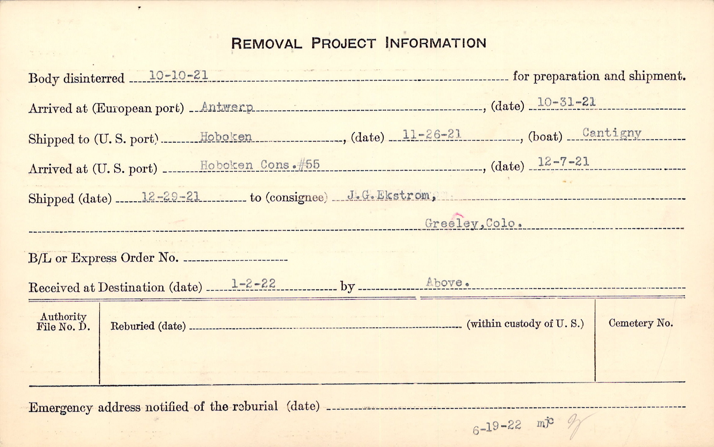 Body disinterred 10/10/1921 for preparation and shipment.