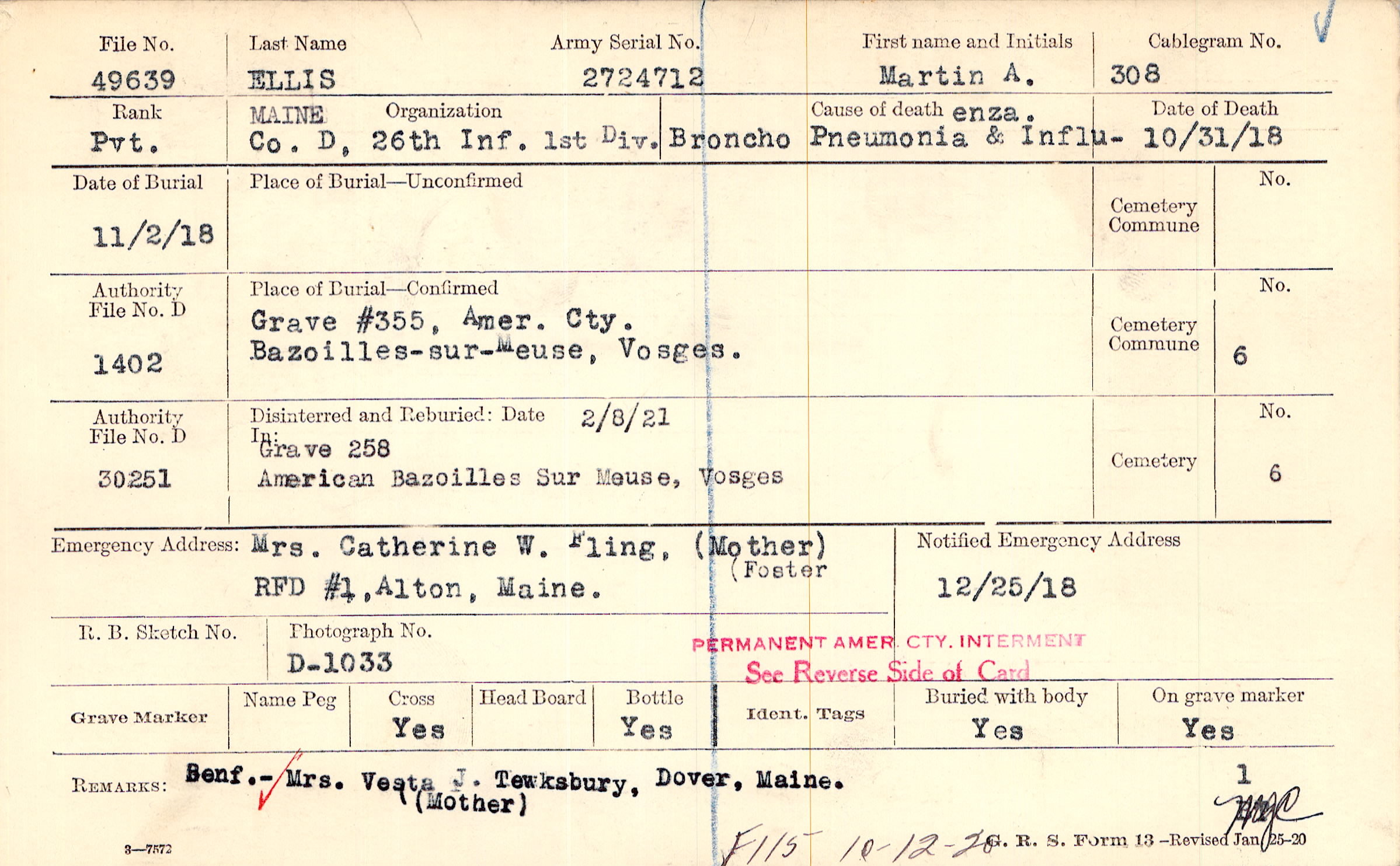 Benef.- Mrs. Vesta J. Tewksbury, Dover, Maine. (Mother), F115 10-12-20