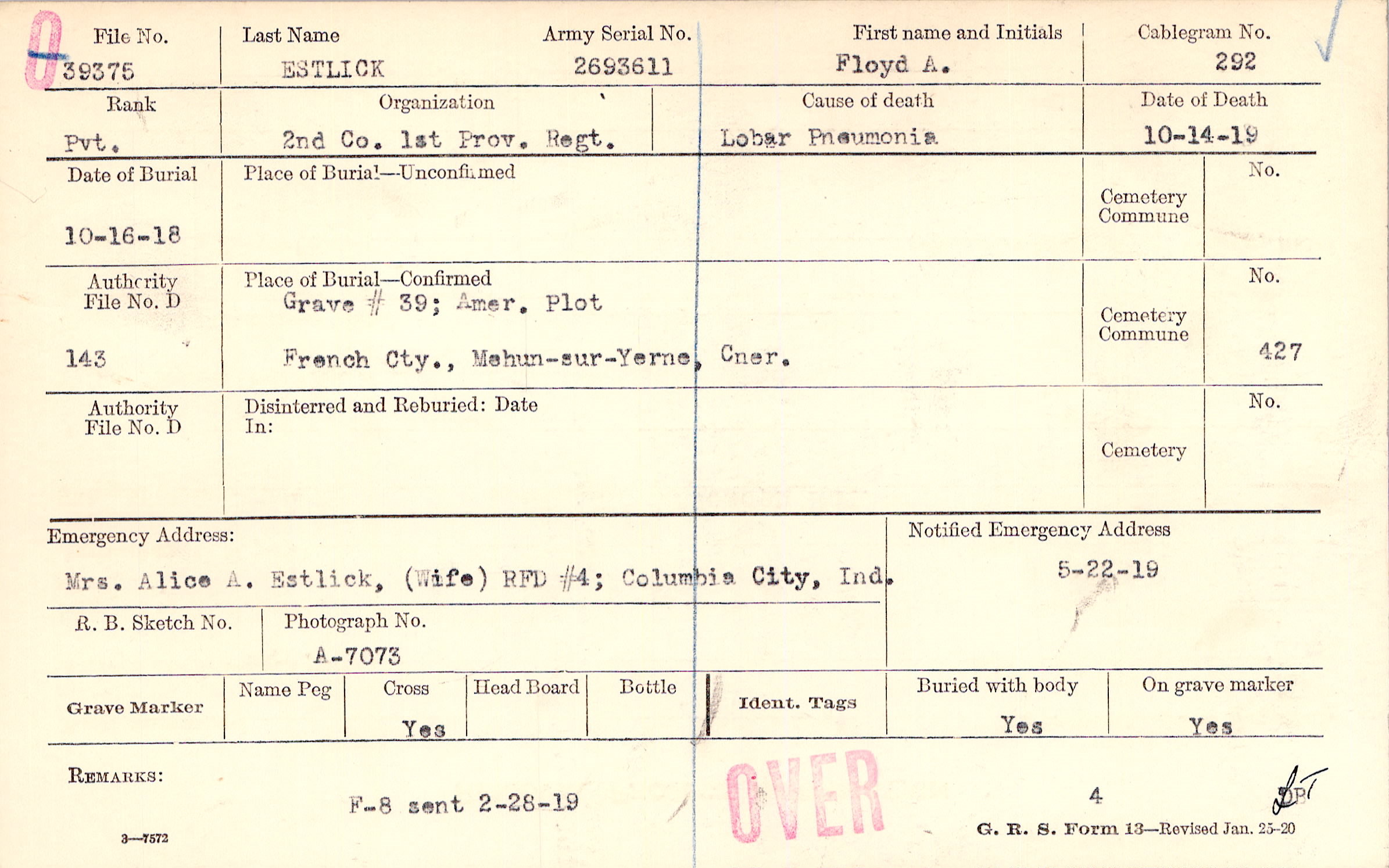 Grave # 39, Amer. Plot, French Cty., Mehun-sur-Yerne, Cher.