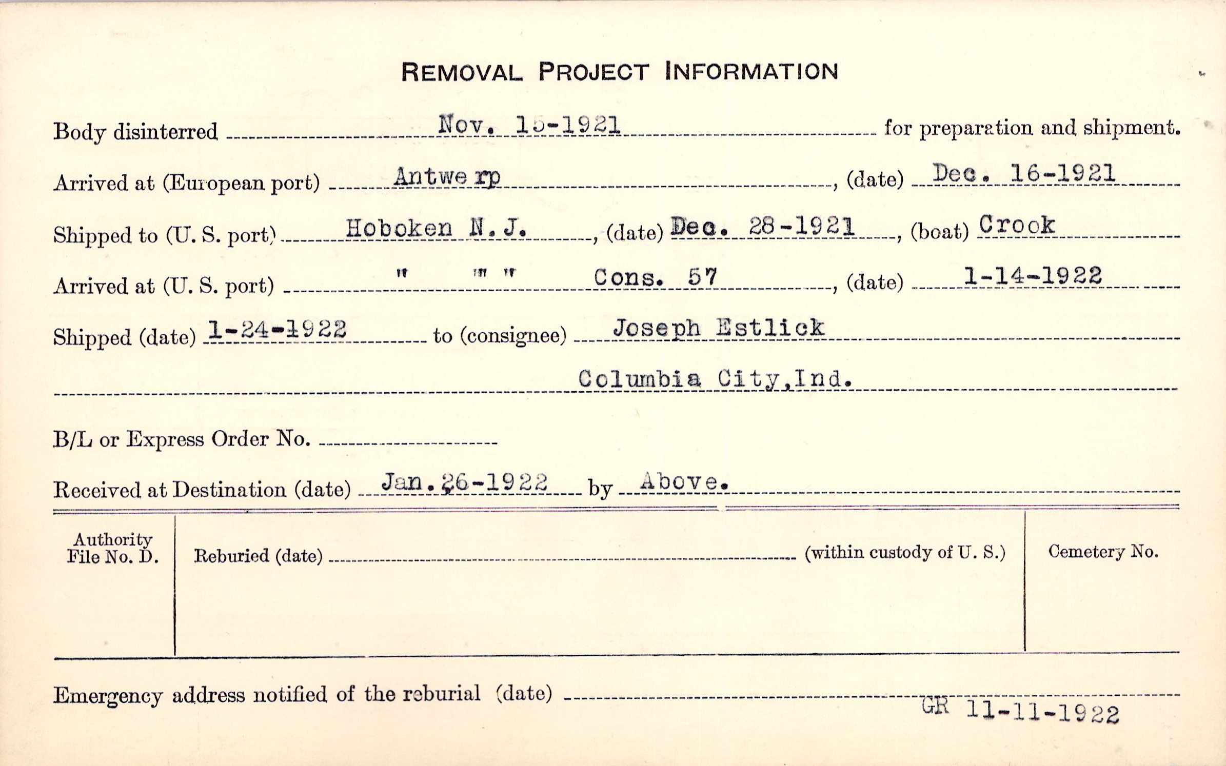 Mrs. Alice A. Estlick, (Wife), RFD #4; Columbia City, Ind.