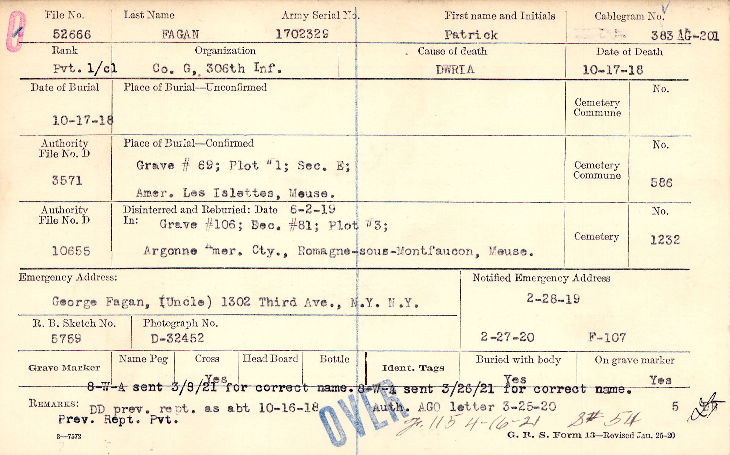 Grave 106, Section 81, Plot 3, Argonne American Cemetery, Romagne-sous-Montfaucon, Meuse