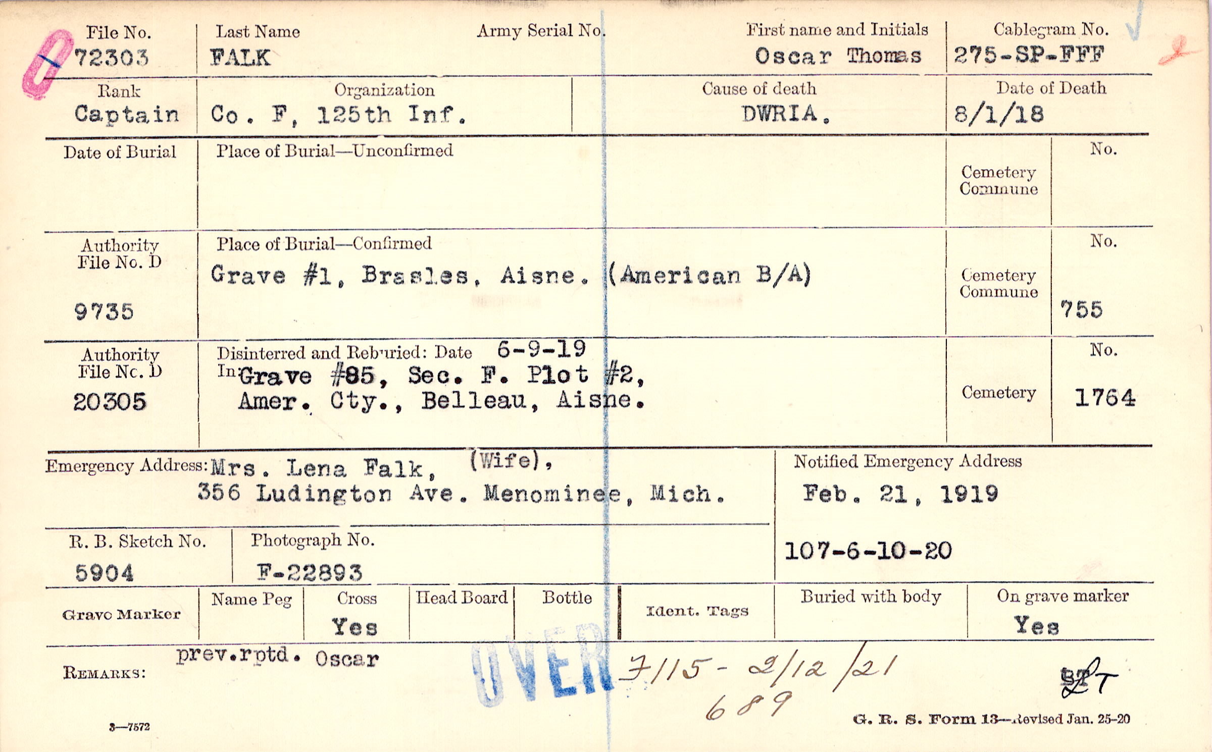 Grave 85, Section F, Plot 2, American Cemetery, Belleau, Aisne