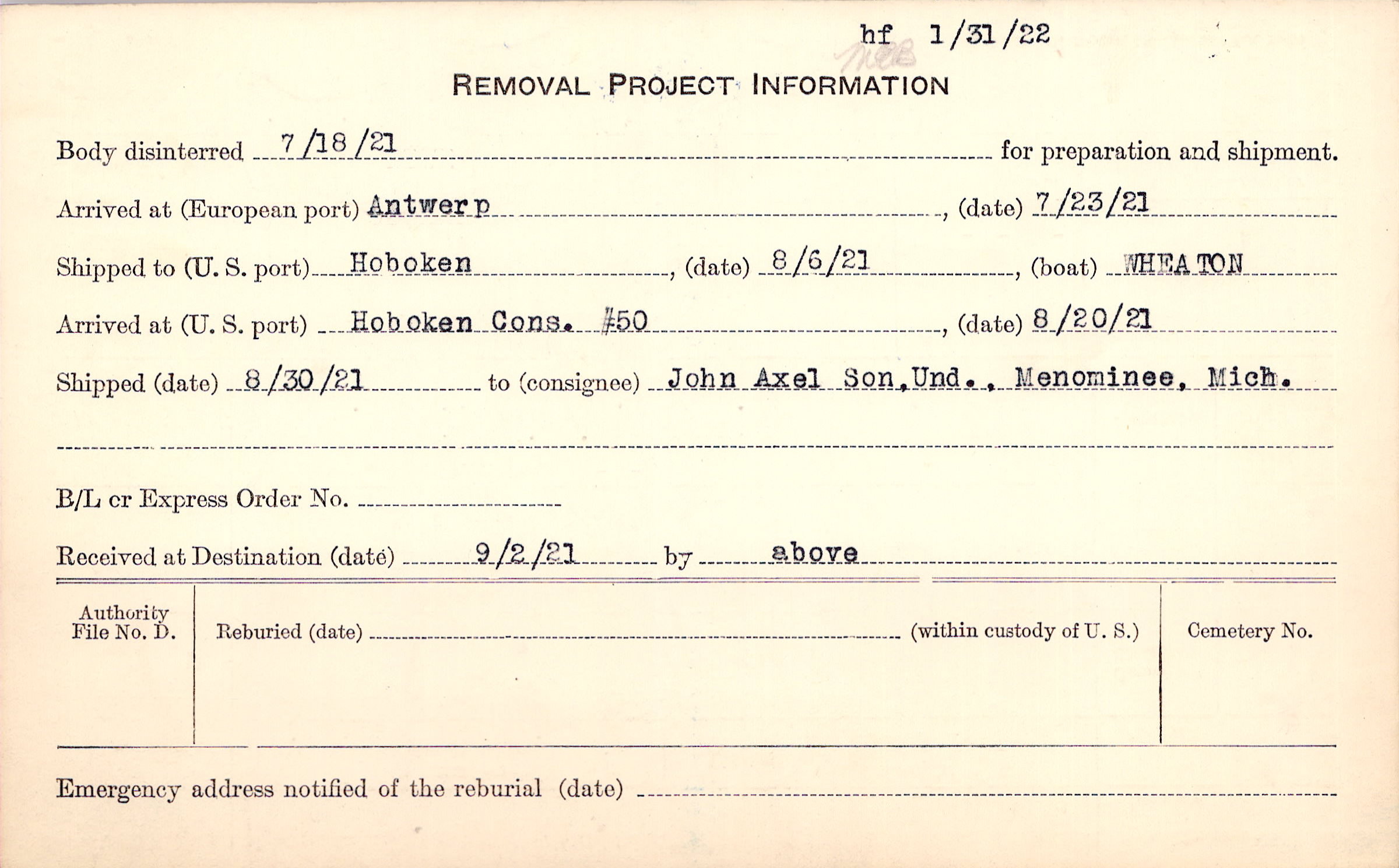 Mrs. Lena Falk, (Wife),, 356 Ludington Ave. Menominee, Mich.