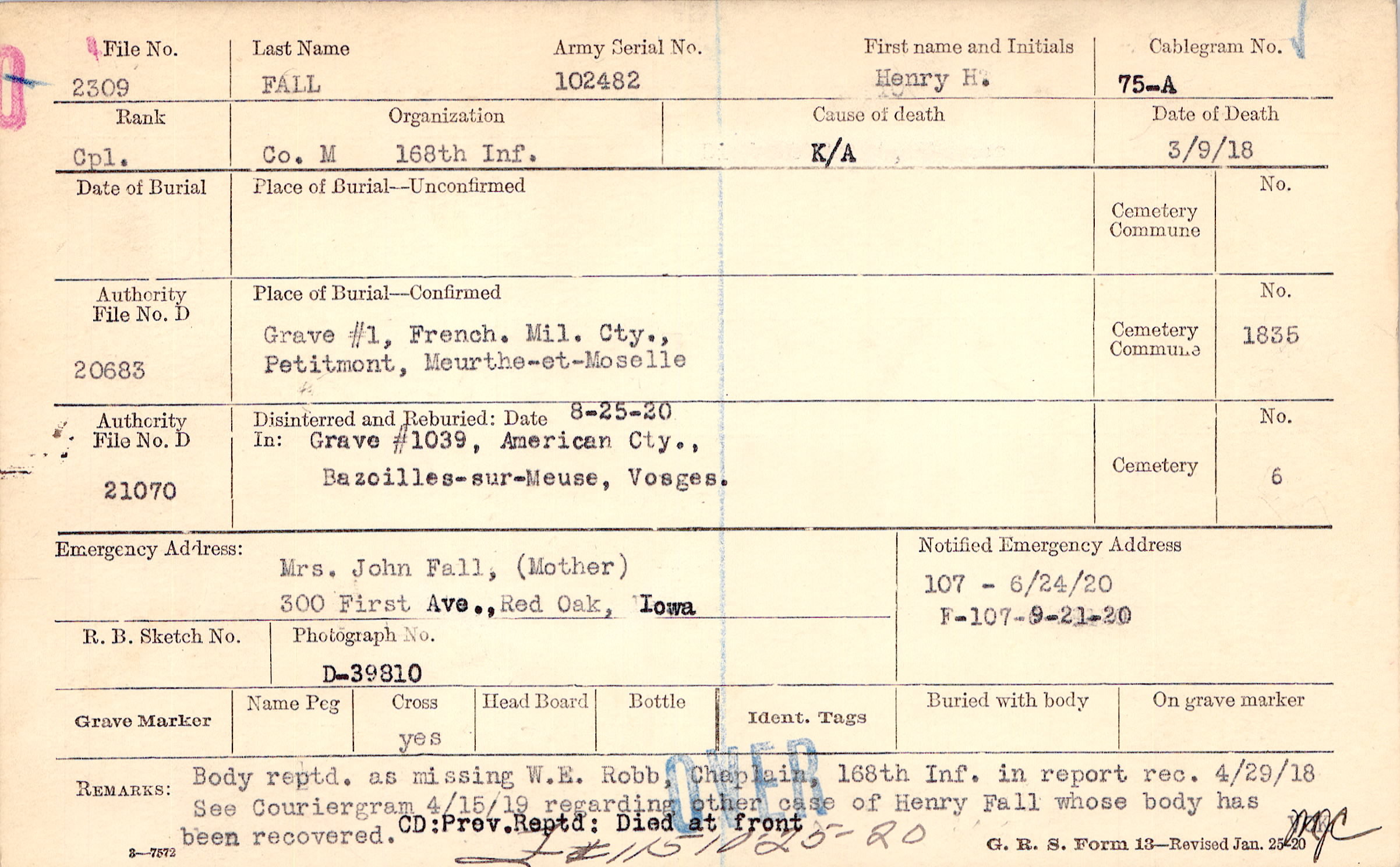 Body reptd. as missing W. E. Robb, Chaplain, 168th Inf. in report rec. 4/29/18 See Couriergram 4/15/19 regarding other case of Henry Fall whose body has been recovered CD: Prev. Reptd: Died at front, F#115 10-25-20