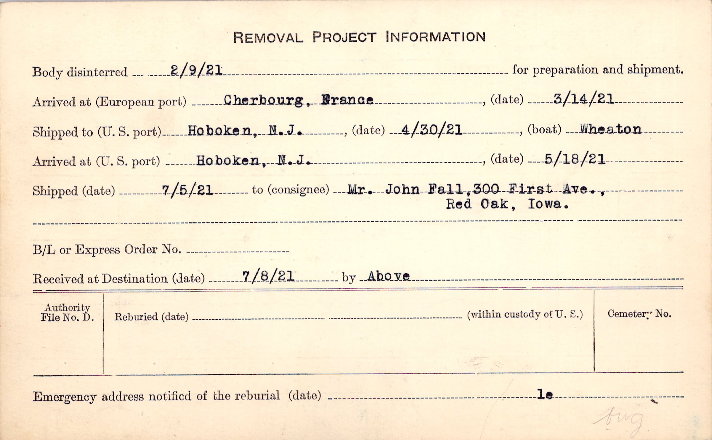 Body disinterred 2/9/1921 for preparation and shipment.