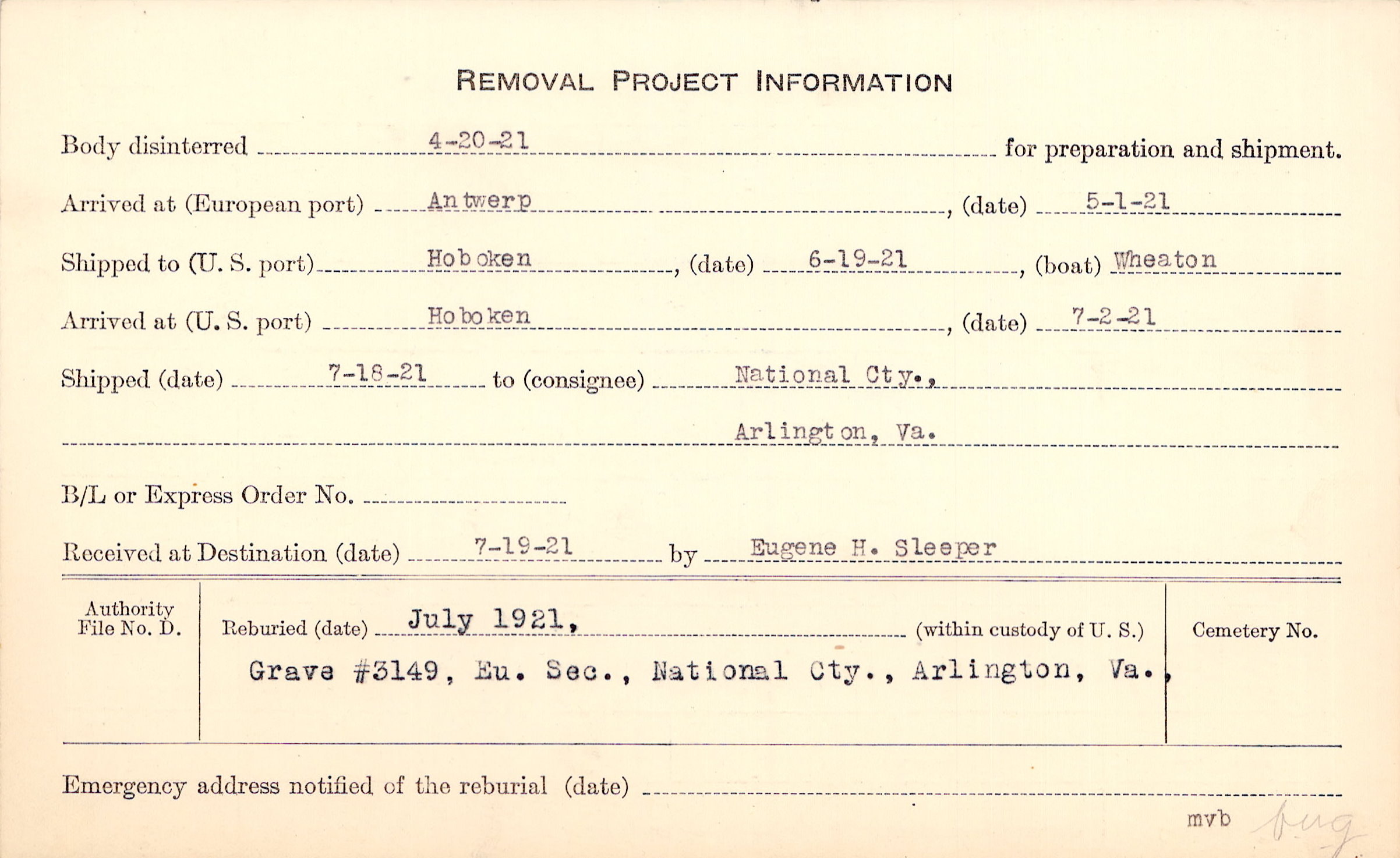 Body disinterred 4/20/1921 for preparation and shipment.