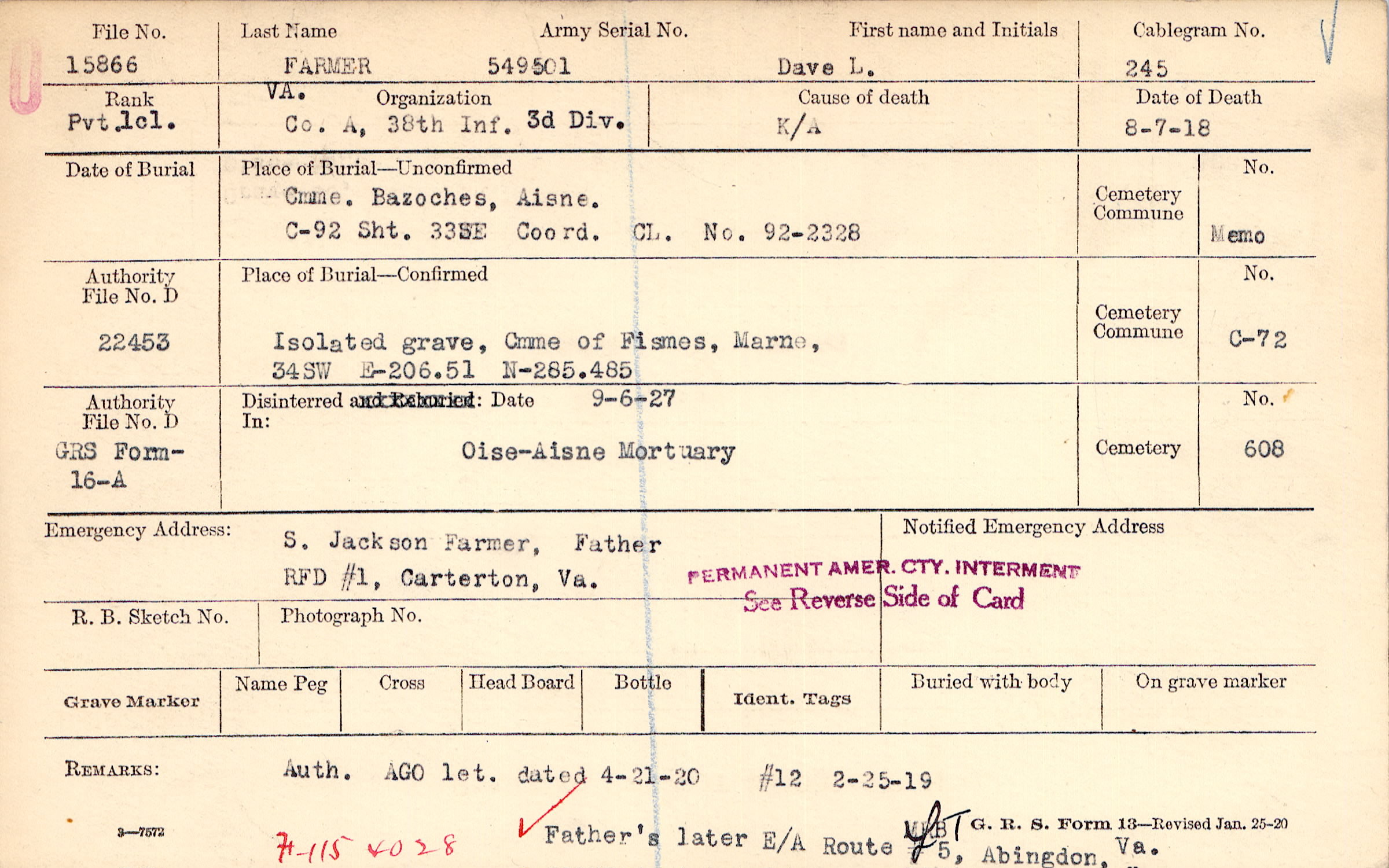 Auth. AGO let. dated 4-21-20 Father's later E/A Route #5, Abingdon, Va., #12 2-25-19, F-115 4028