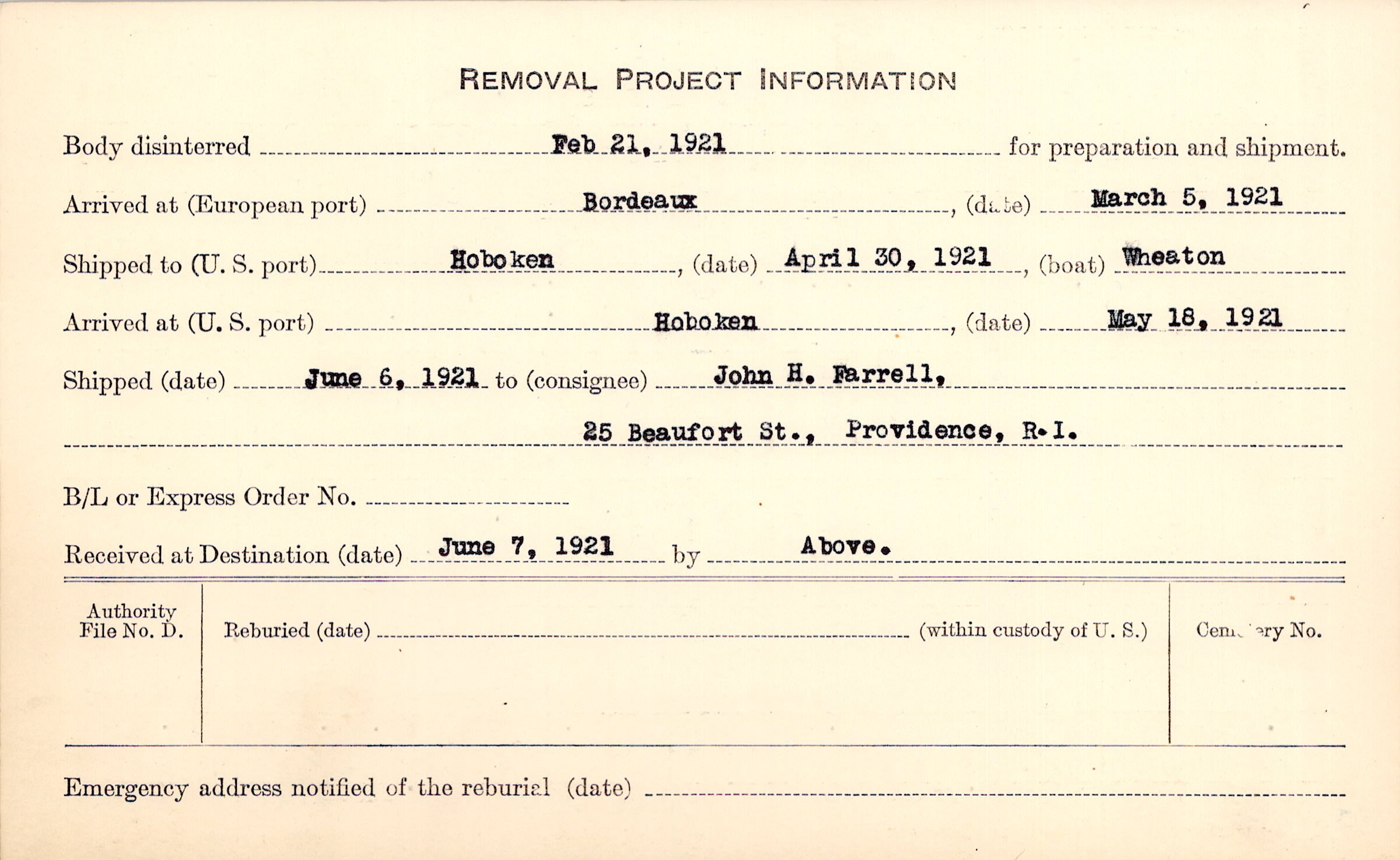 John A. Farrell, (Father), 25 Beaufort St., Providence, R.I.