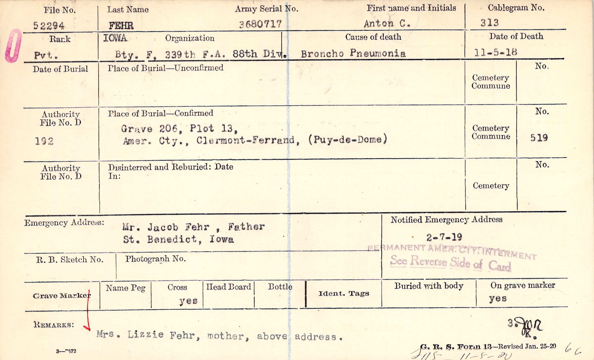 Grave 206, Plot 13, Amer. Cty., Clermont-Ferrand, Puy-de-Dome