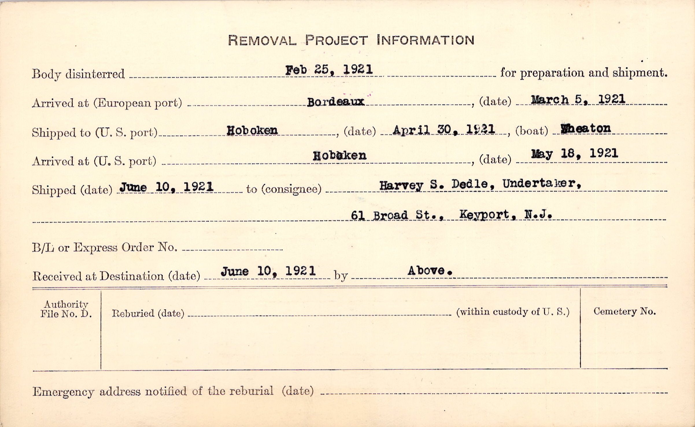 Body disinterred 2/25/1921 for preparation and shipment.