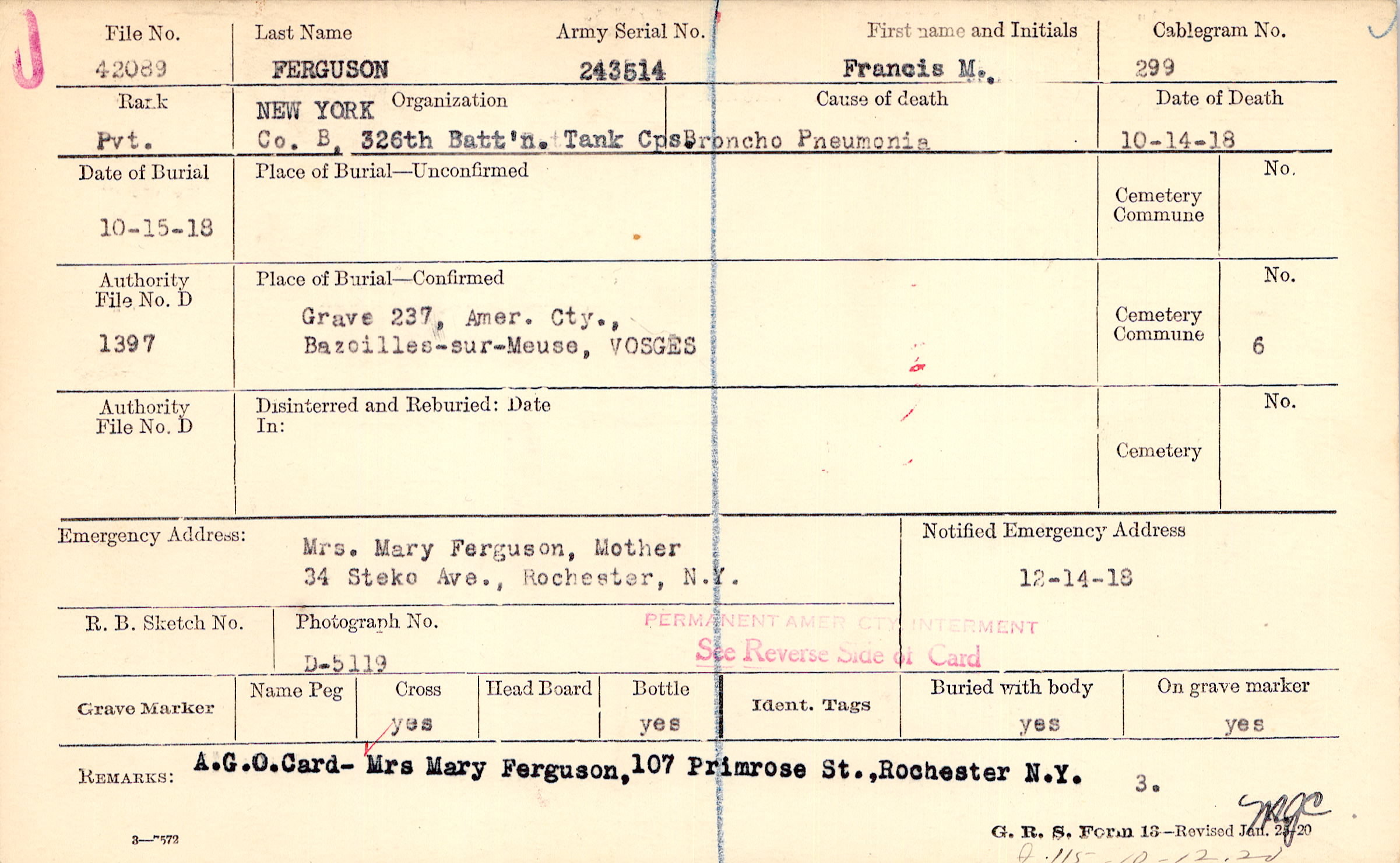 A.G.O. Card Mrs. Mary Ferguson, 107 Primrose St., Rochester, N.Y., F115 10-12-20