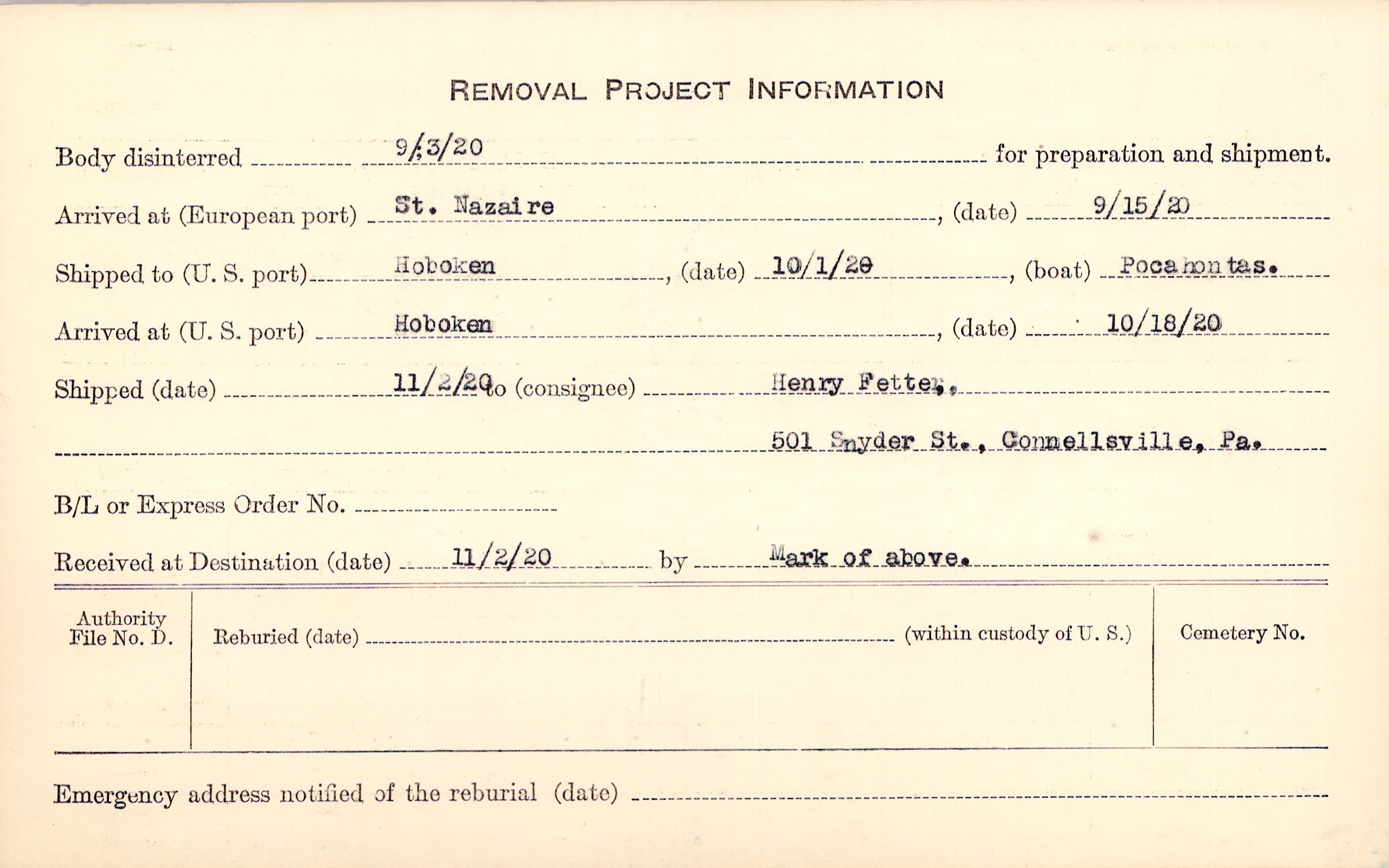 Body disinterred 9/3/1920 for preparation and shipment.