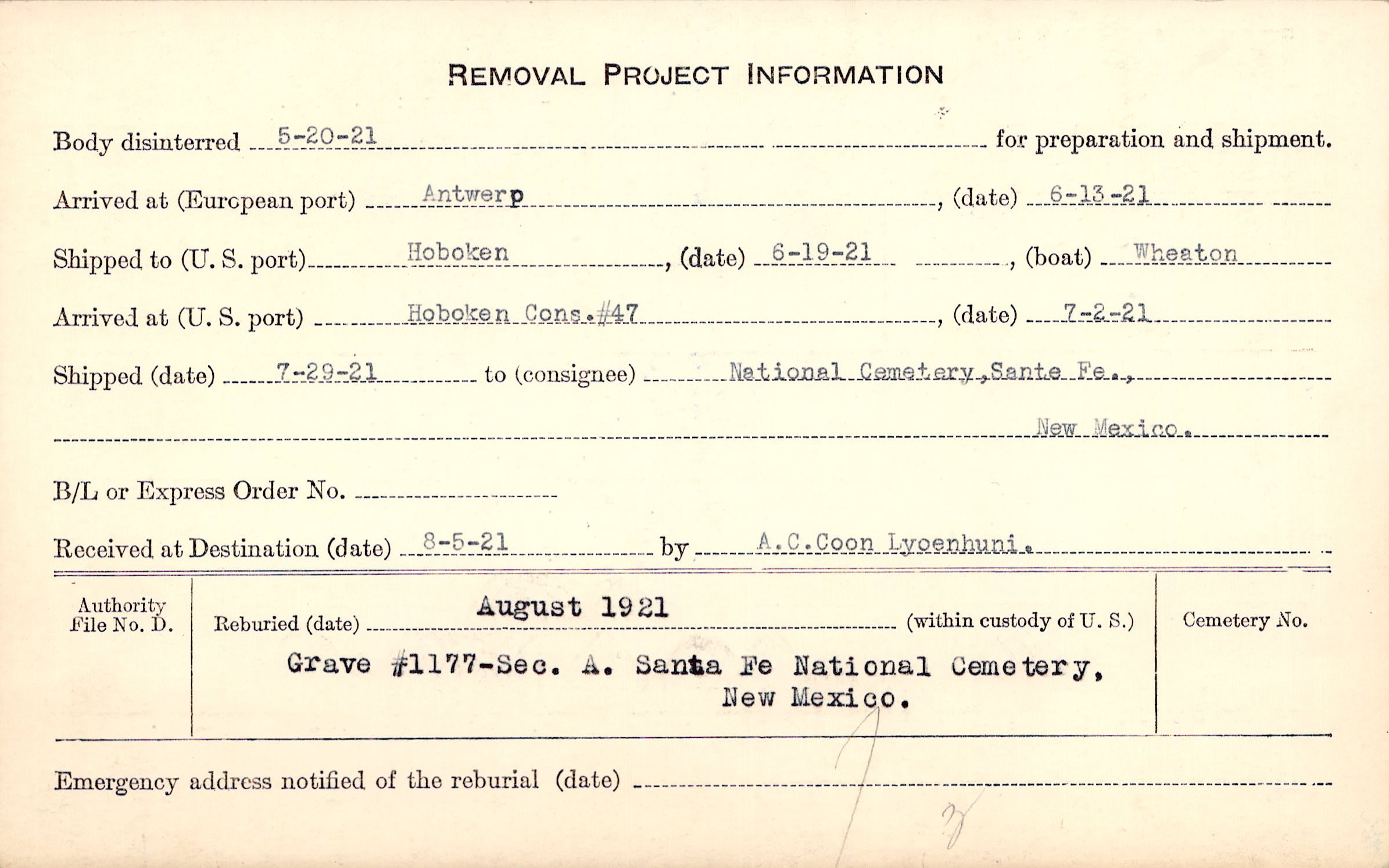Body disinterred 5/20/1921 for preparation and shipment.