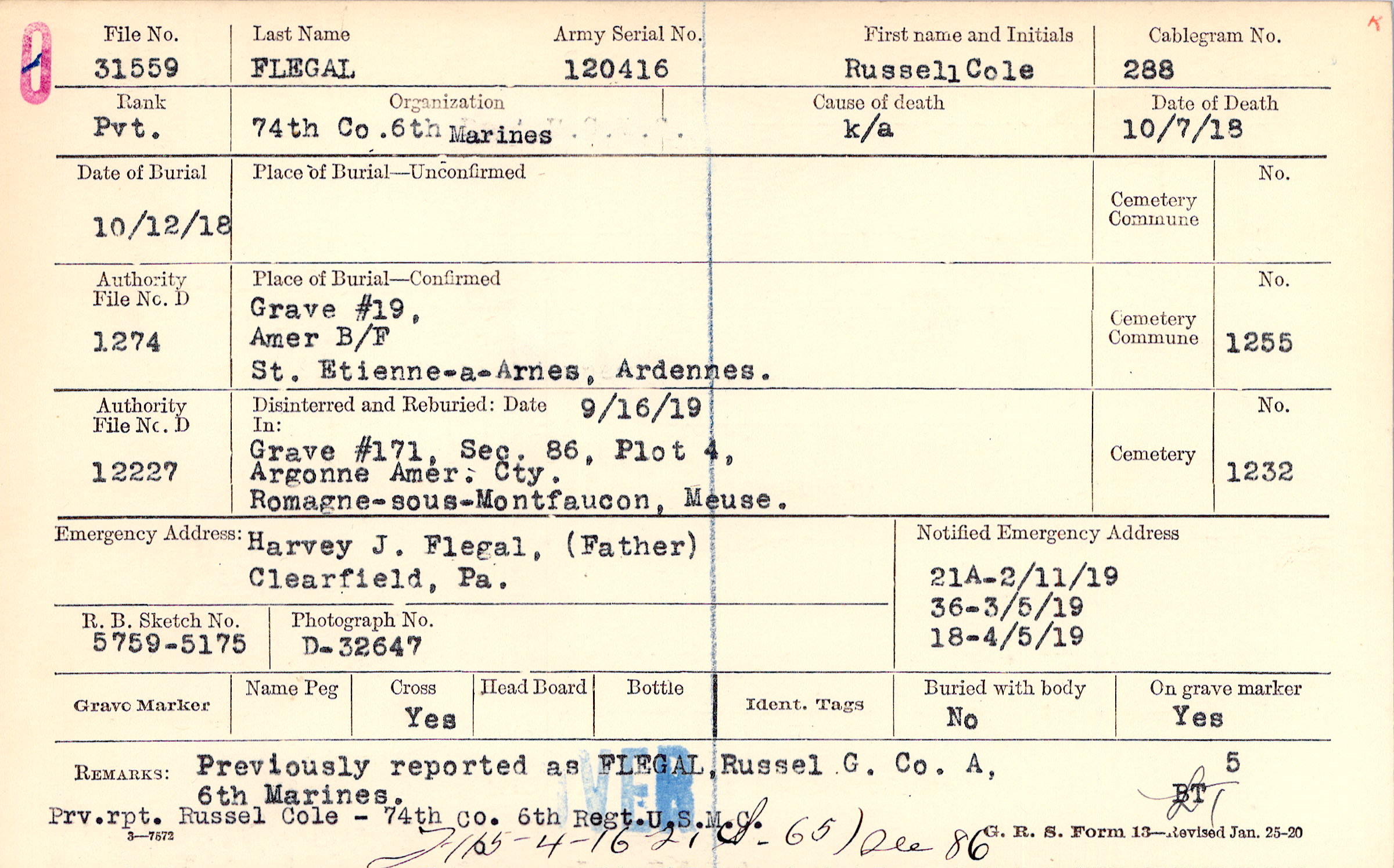 Harvey J. Flegal, (Father), Clearfield, Pa., Previously reported as FLEGAL, Russell G. Co. A, 6th Marines. Prv. rpt. Russell Cole - 74th Co. 6th Regt. U.S.M.C.