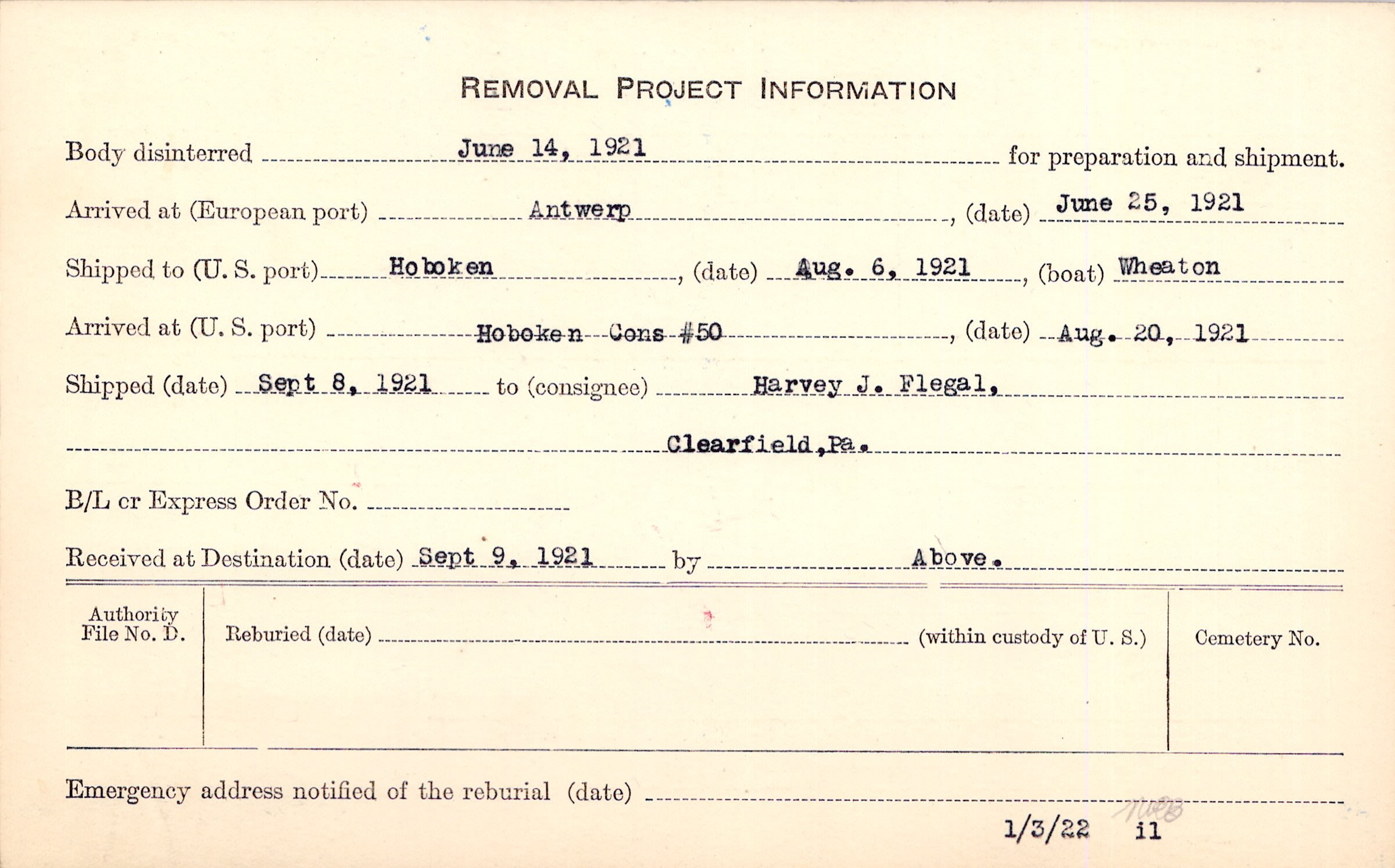 Body disinterred 6/14/1921 for preparation and shipment.