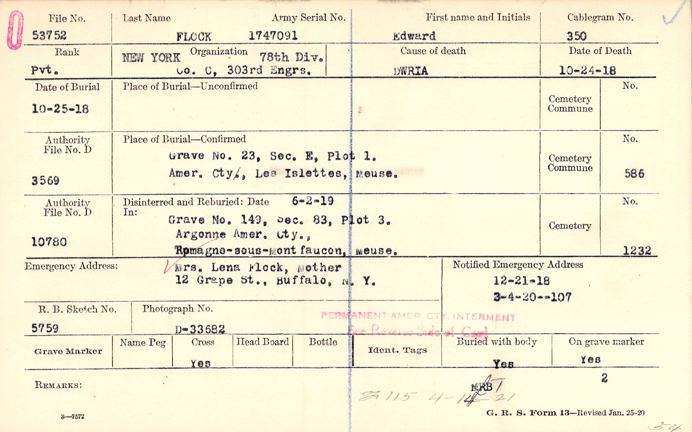 Grave 23, Sec. E, Plot 1., Amer. Cty., Les Islettes, Meuse.
