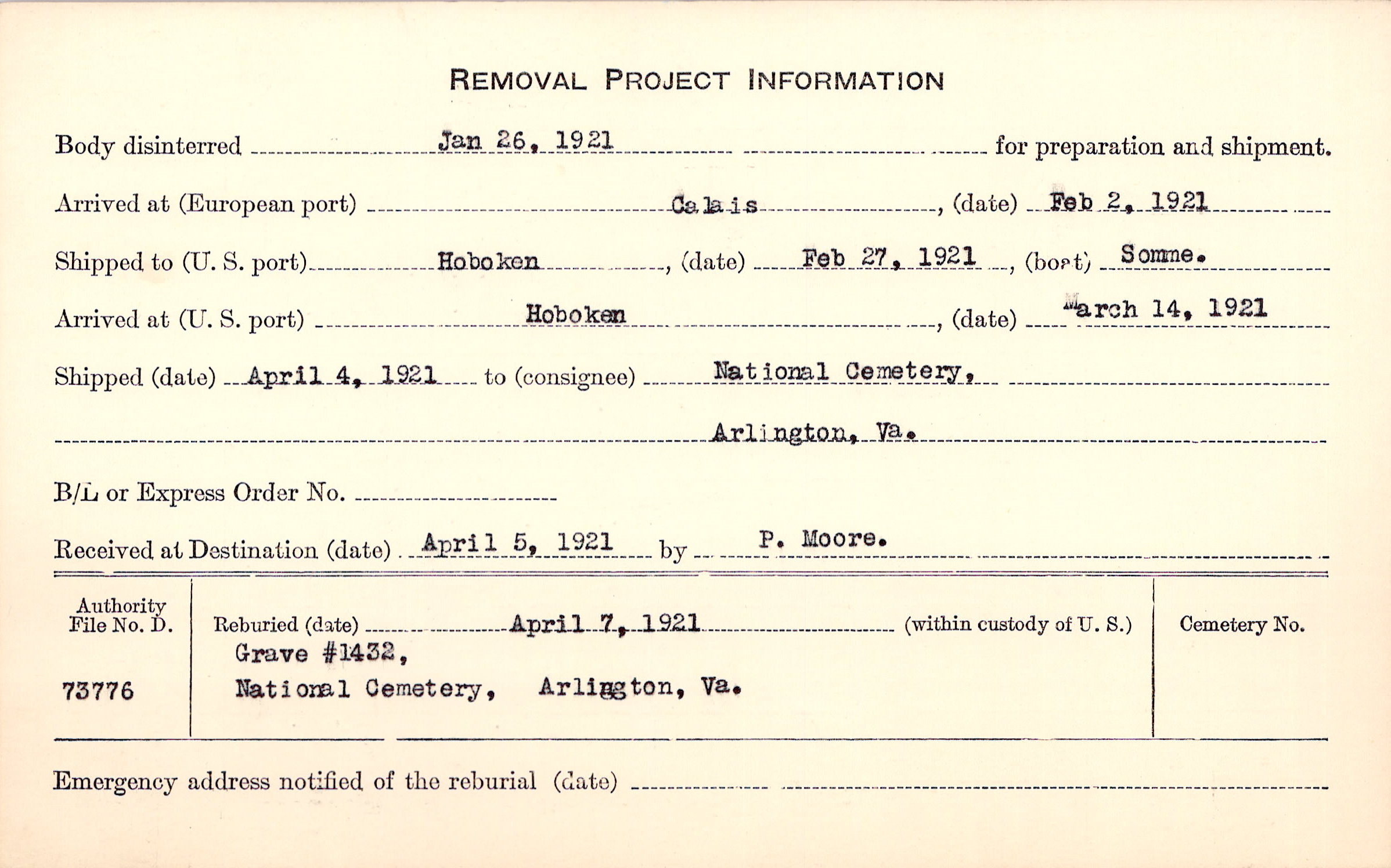 Body disinterred 1/26/1921 for preparation and shipment.