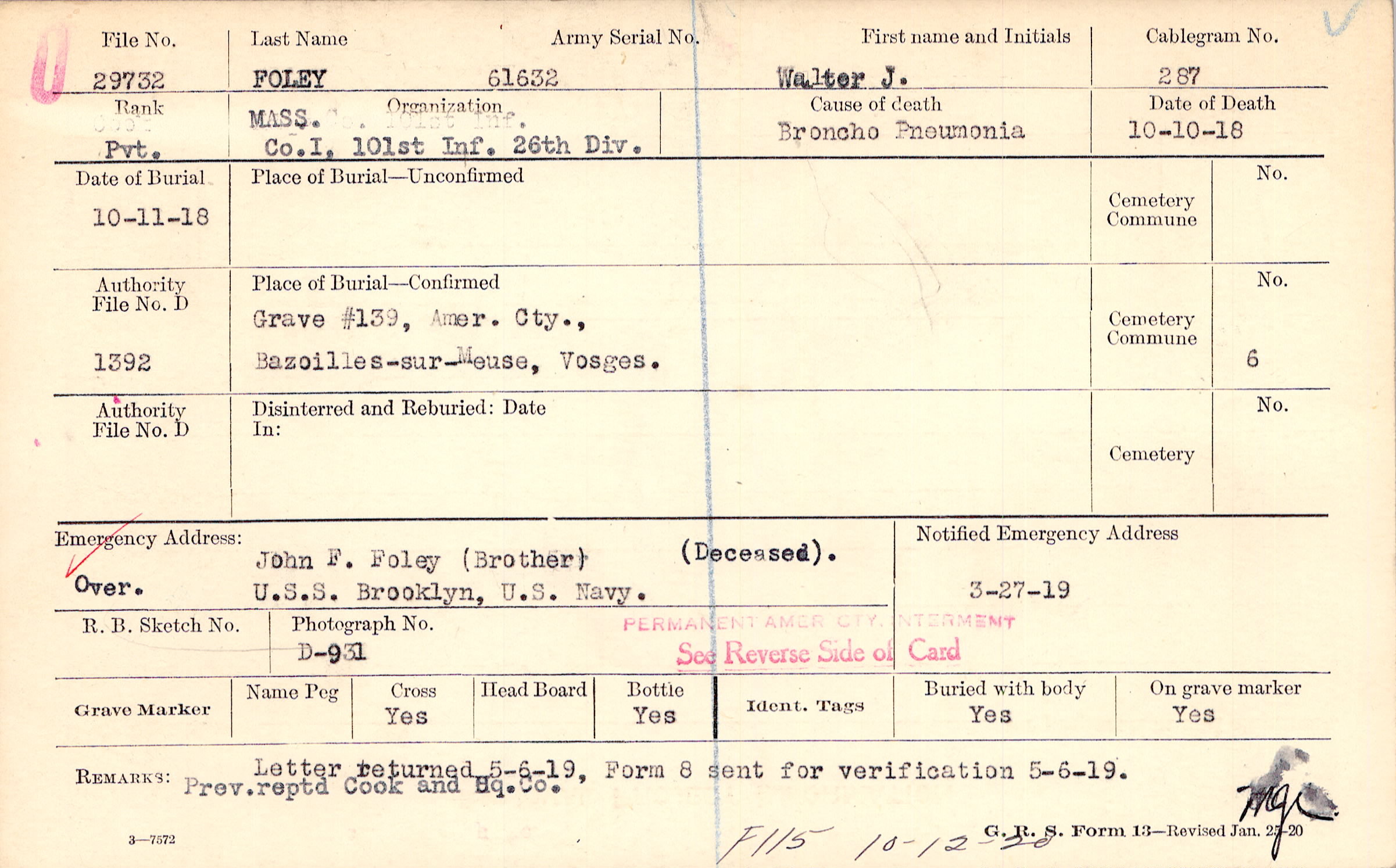 Letter returned 5-6-19, Form 8 sent for verification 5-6-19. Prev. reptd Cook and Hq. Co., F115 10-12-20