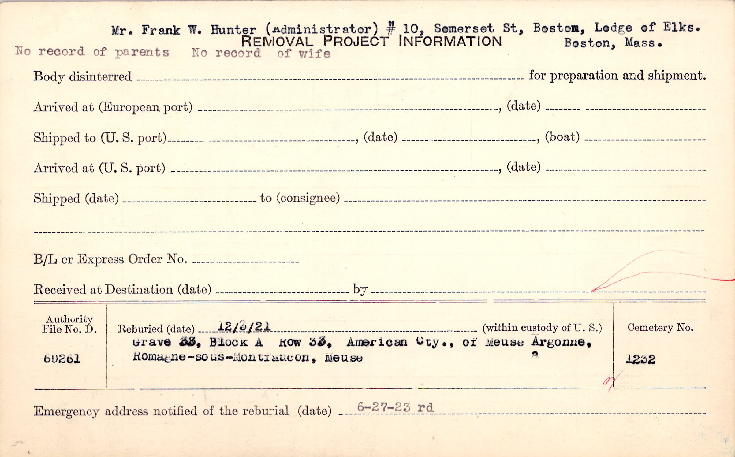 Mr. Frank W. Hunter (Administrator) #10, Somerset St, Boston, Lodge of Elks. Boston, Mass. No record of parents No record of wife |