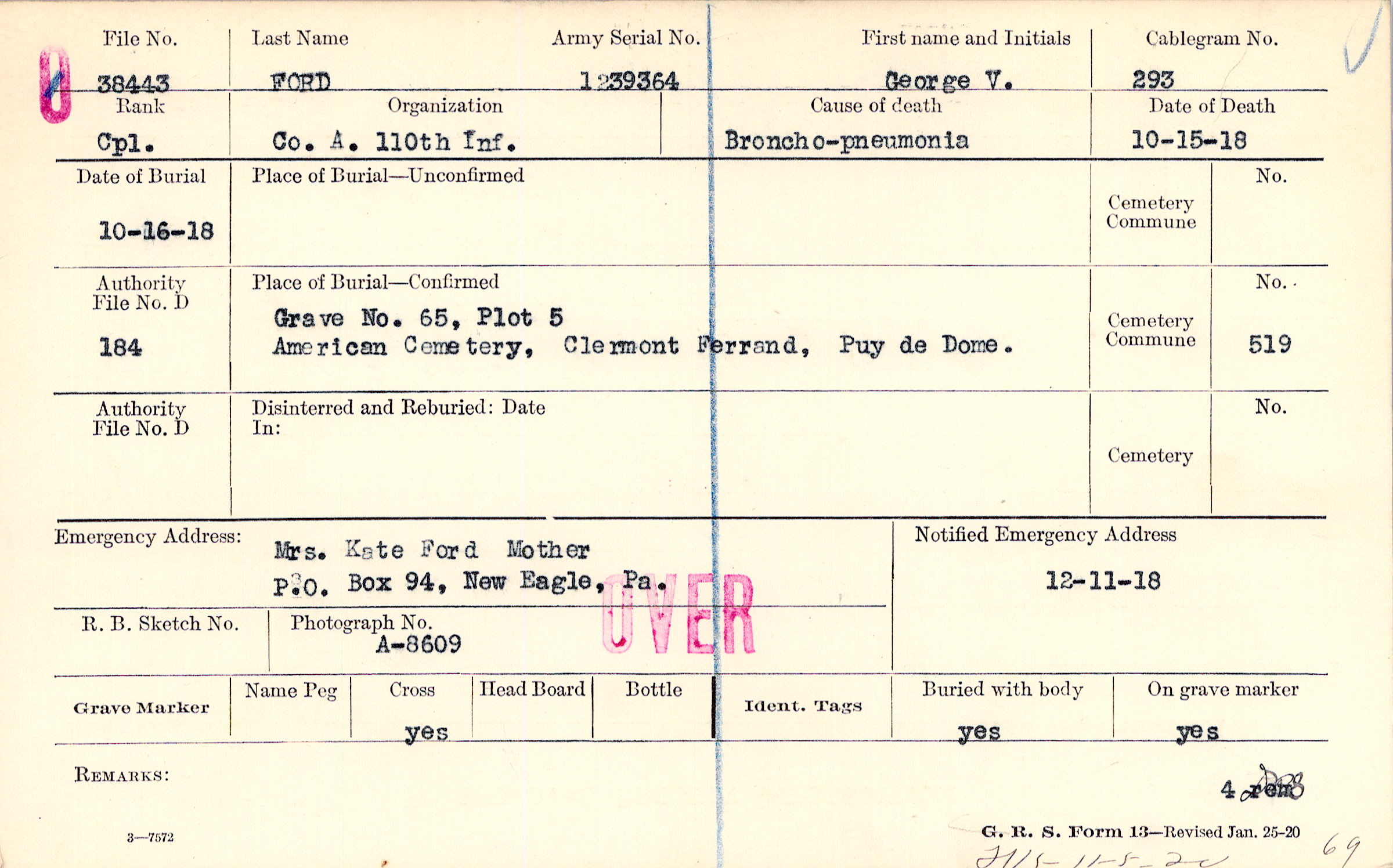 Grave 65, Plot 5, American Cemetery, Clermont Ferrand, Puy de Dome.