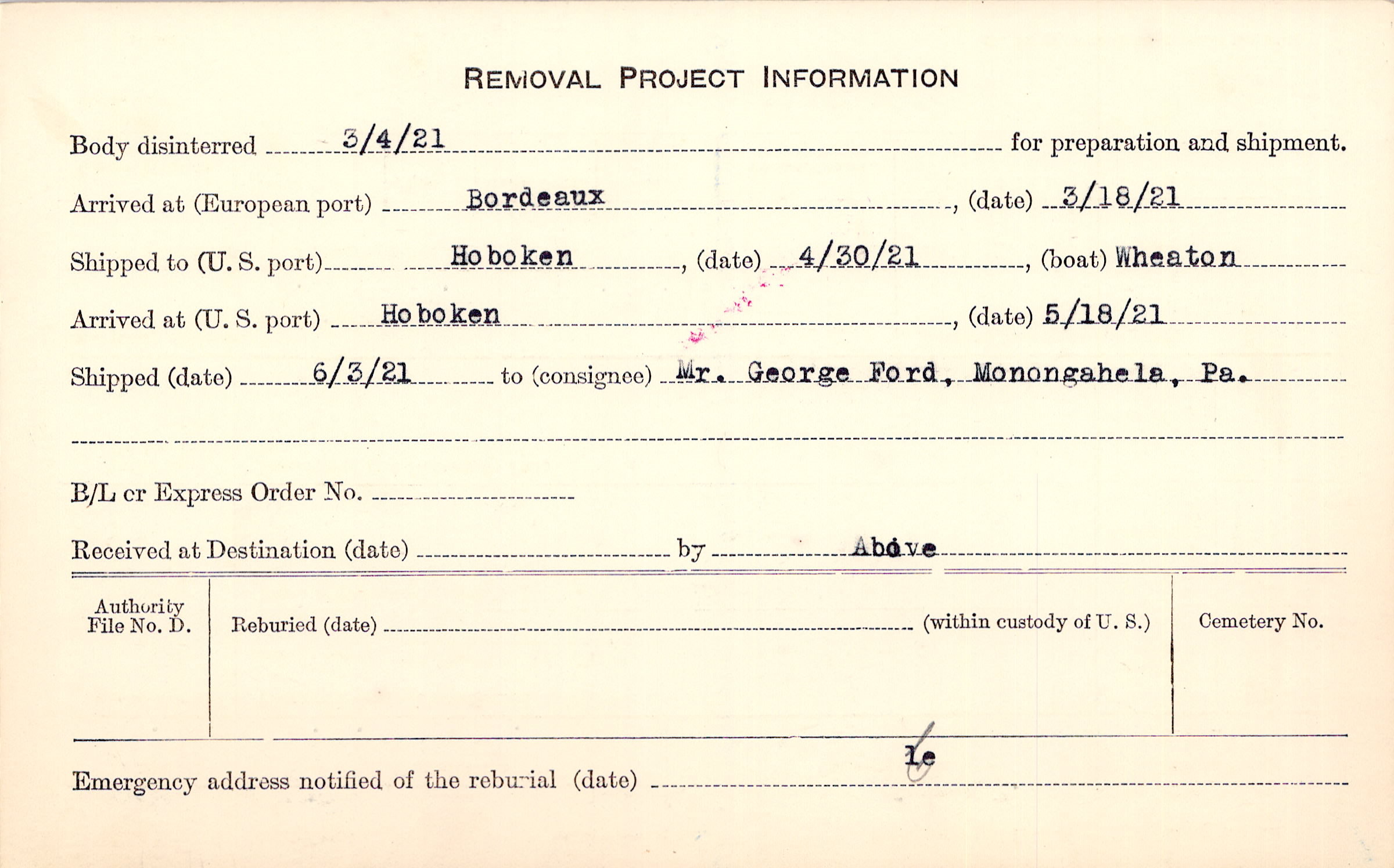 Body disinterred 3/4/1921 for preparation and shipment.