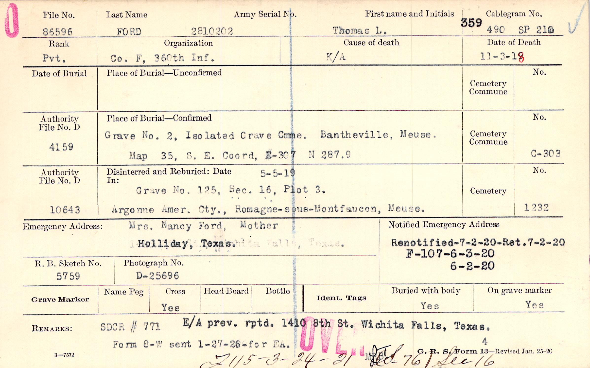 Grave 125, Section 16, Plot 3, Argonne American Cemetery, Romagne-sous-Montfaucon, Meuse