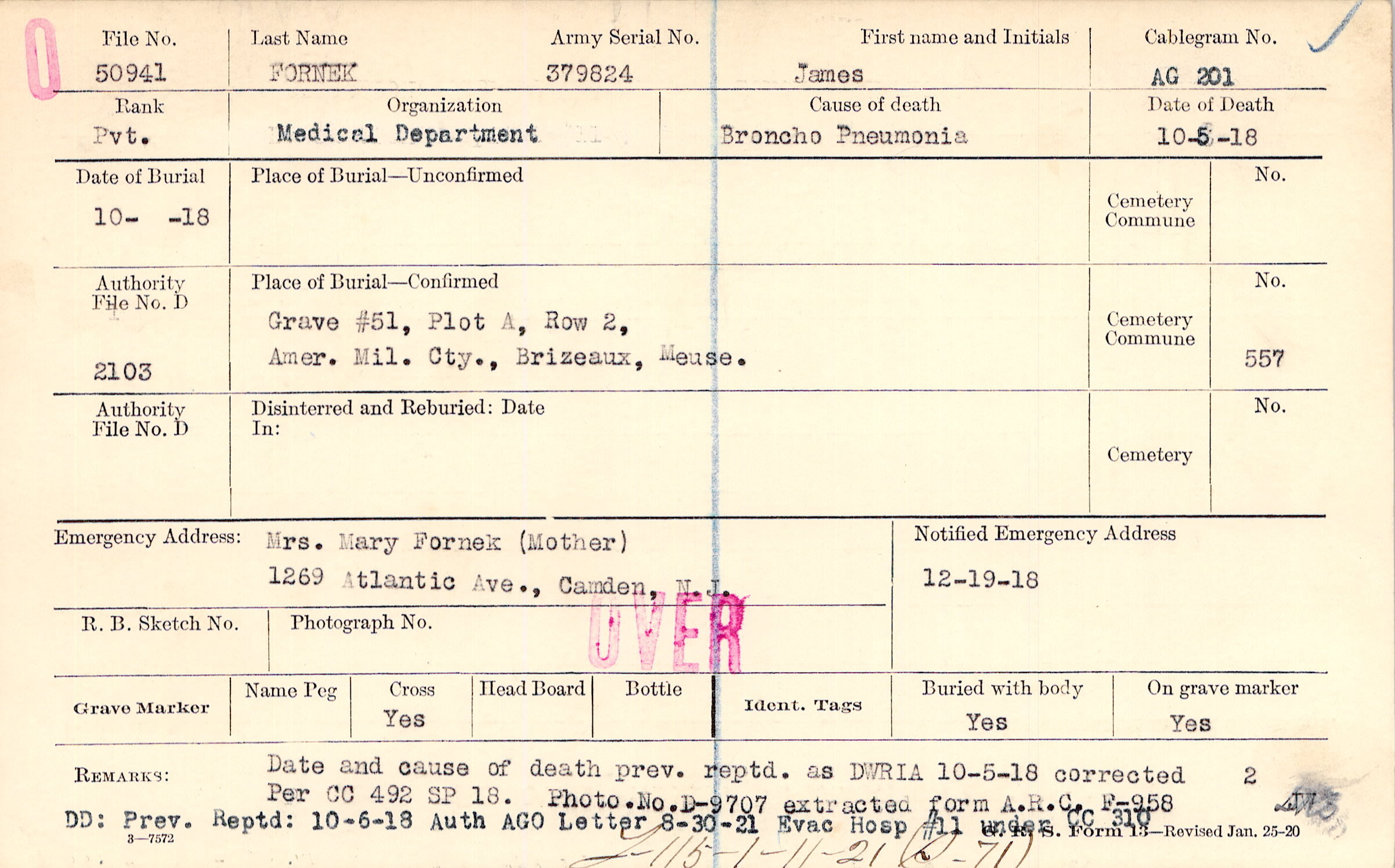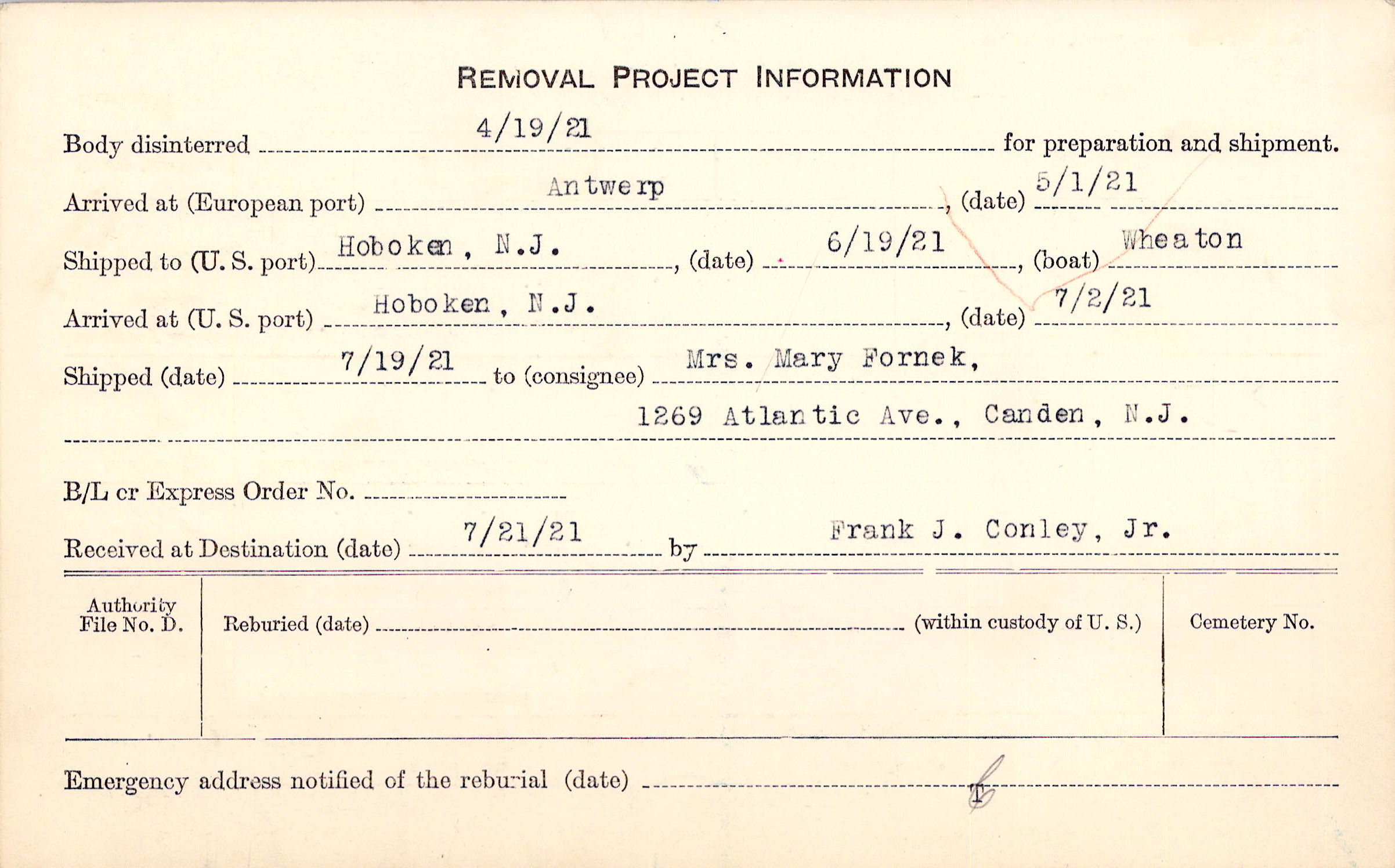 Mrs. Mary Fornek (Mother), 1269 Atlantic Ave., Camden, N.J.