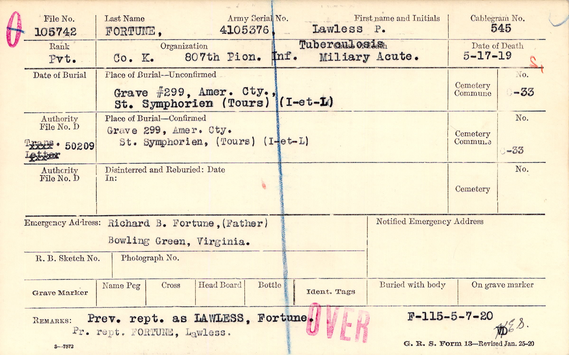 Grave 299, Amer. Cty., St. Symphorien, Tours, I-et-L.
