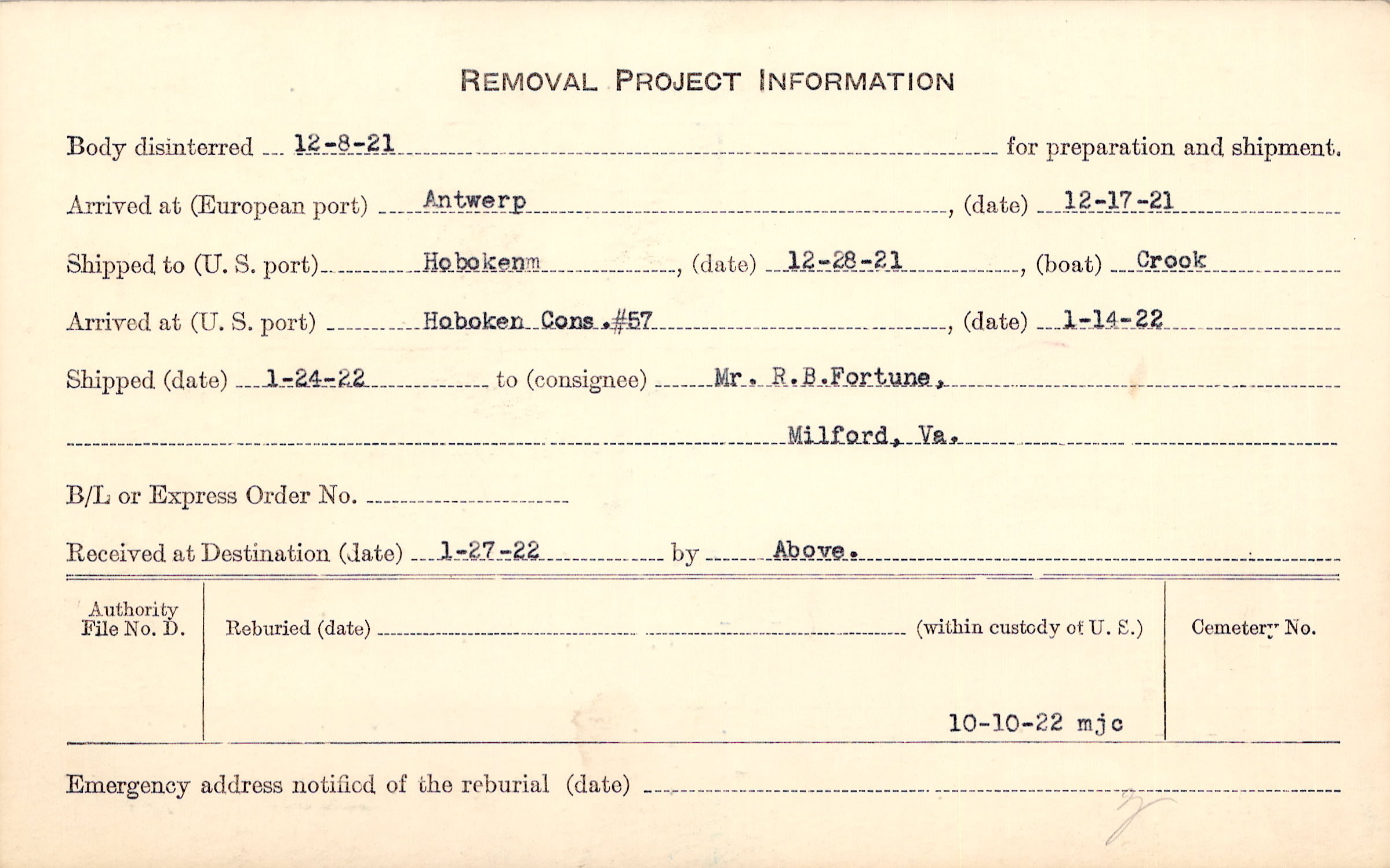 Body disinterred 12/8/1921 for preparation and shipment.