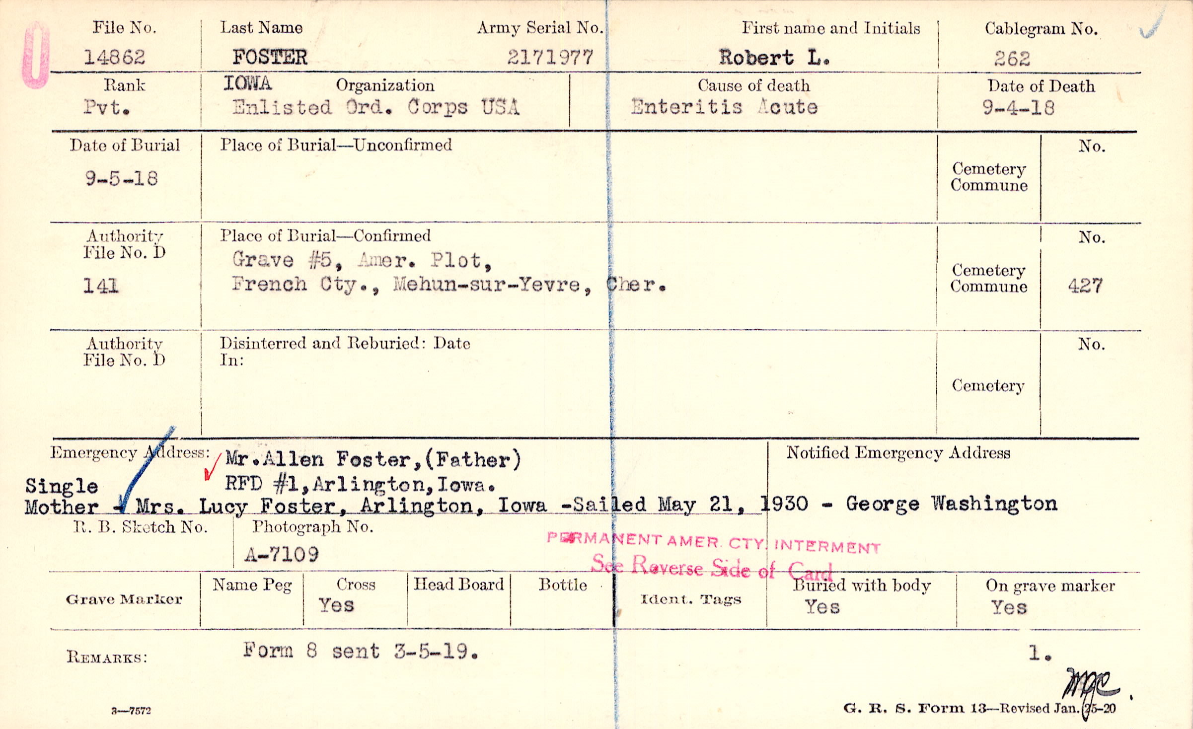 Mr. Allen Foster, (Father), RFD #1, Arlington, Iowa, Single Mother - Mrs. Lucy Foster, Arlington, Iowa - sailed May 21, 1930 - George Washington