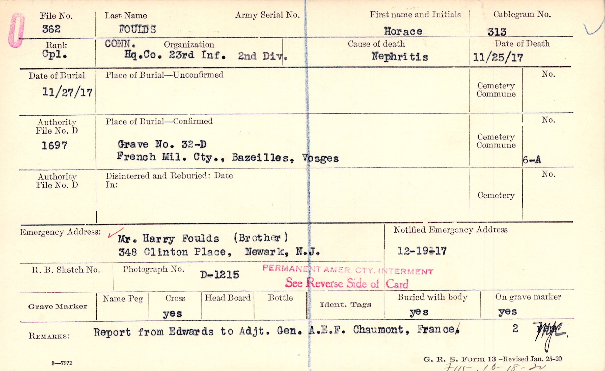 Grave 32-D, French Mil. Cty., Bazeilles, Vosges