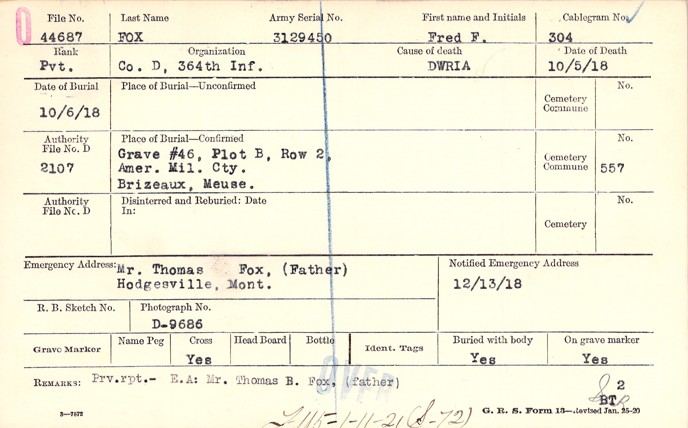 Grave #46, Plot B, Row 2, Amer. Mil. Cty., Brizeaux, Meuse.