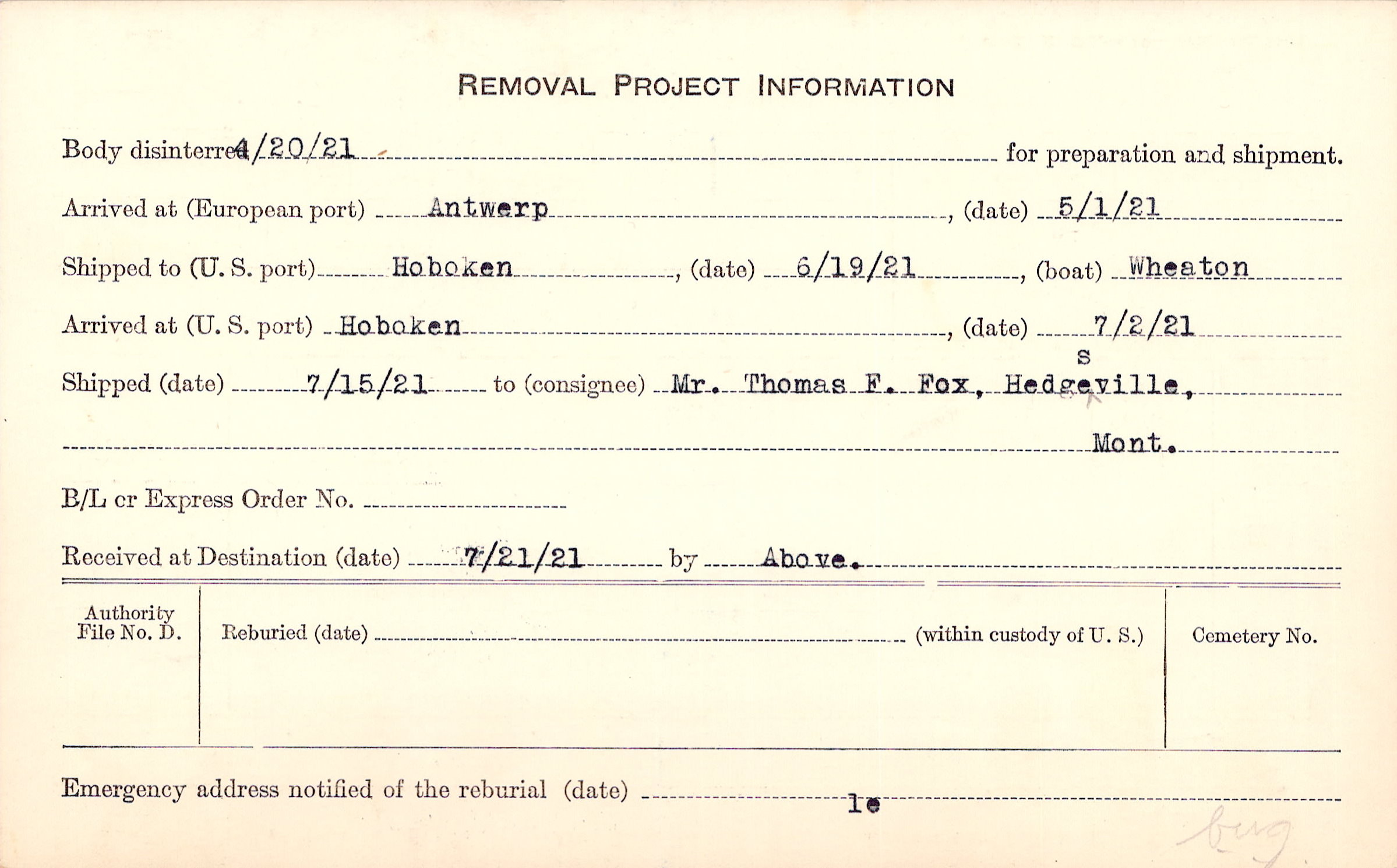 Body disinterred 4/20/1921 for preparation and shipment.