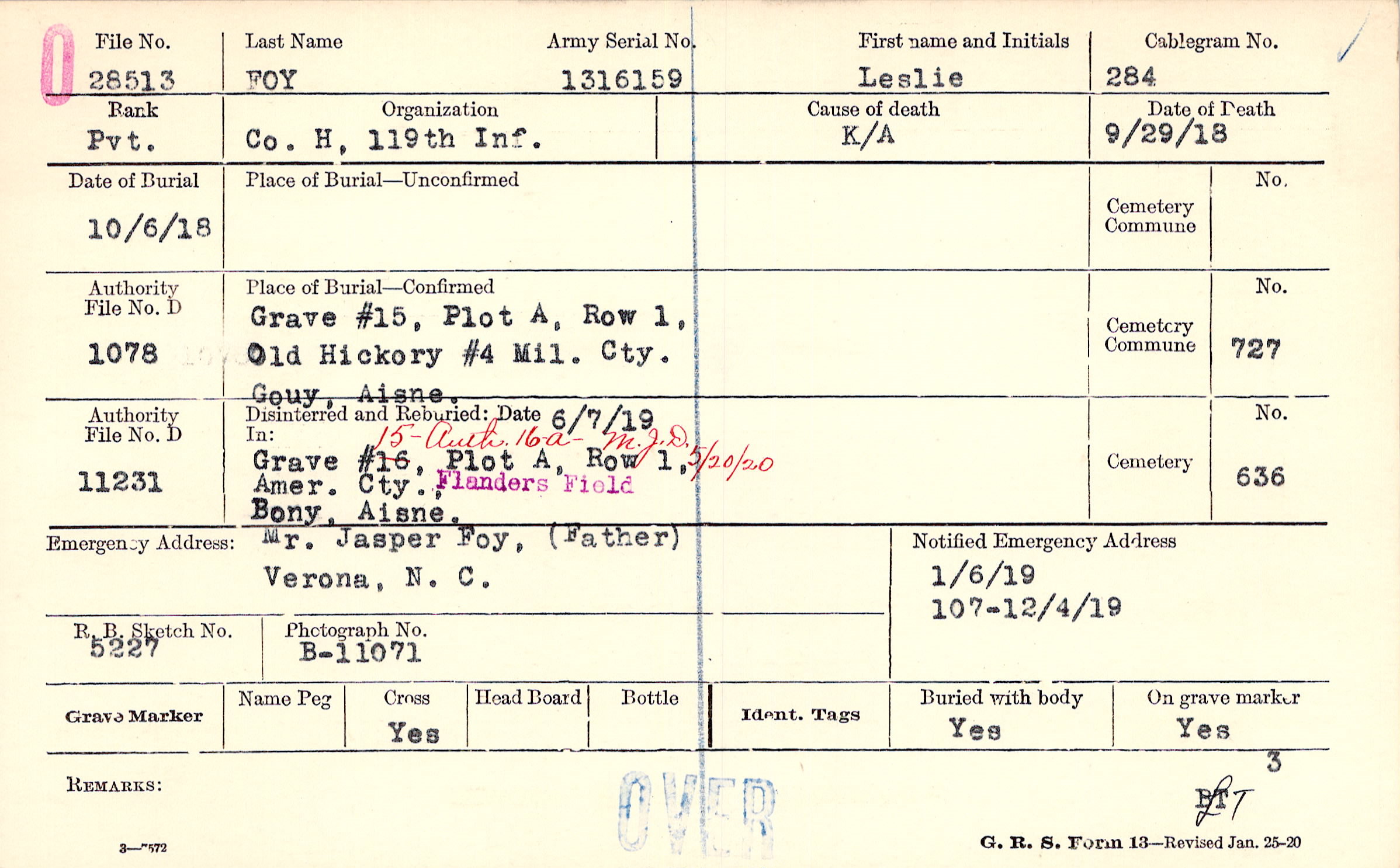 Grave #15, Plot A, Row 1, Old Hickory #4 Mil. Cty., Gouy, Aisne
