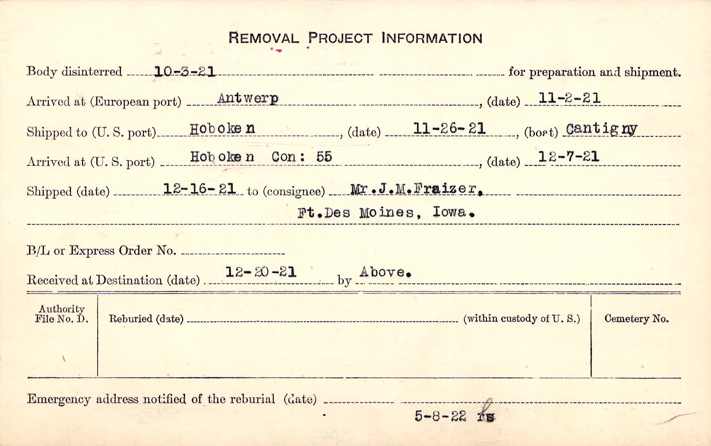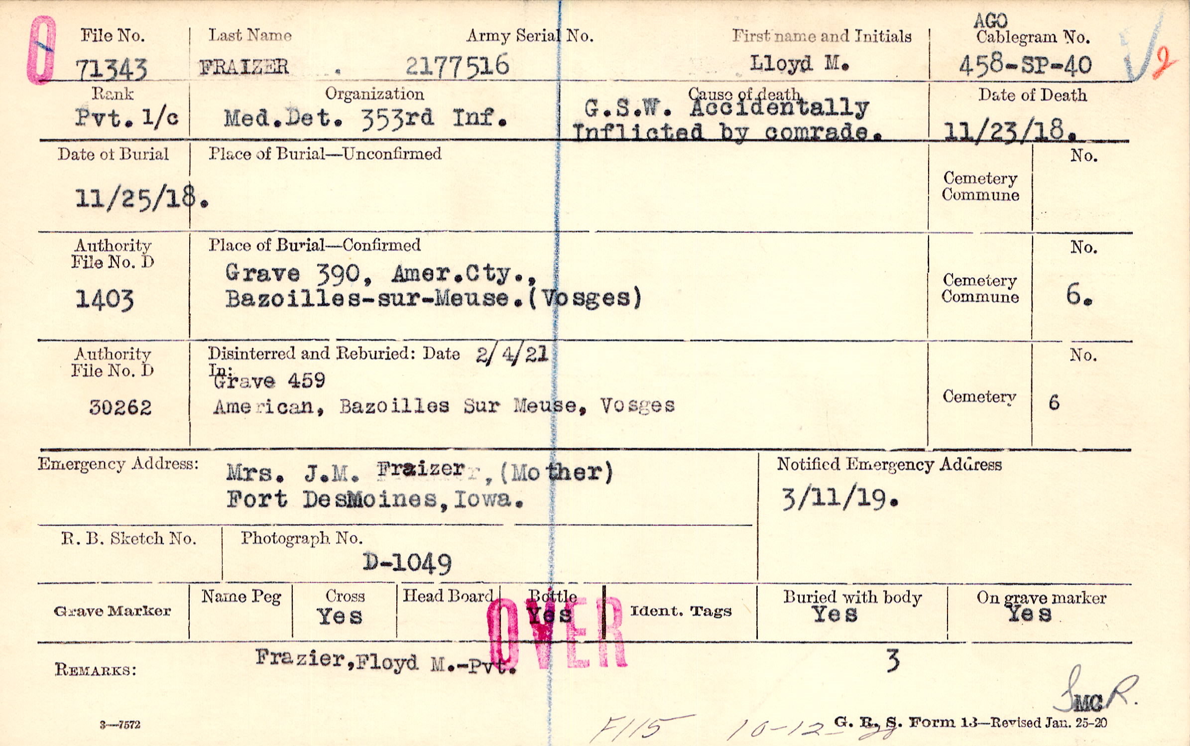Mrs. J.M. Fraizer, (Mother), Fort DesMoines, Iowa.