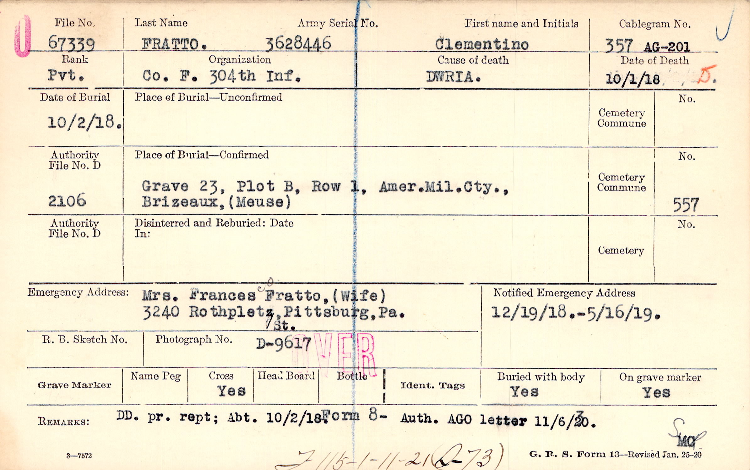 Mrs. Frances Fratto, (Wife), 3240 Rothpletz St., Pittsburgh, Pa.